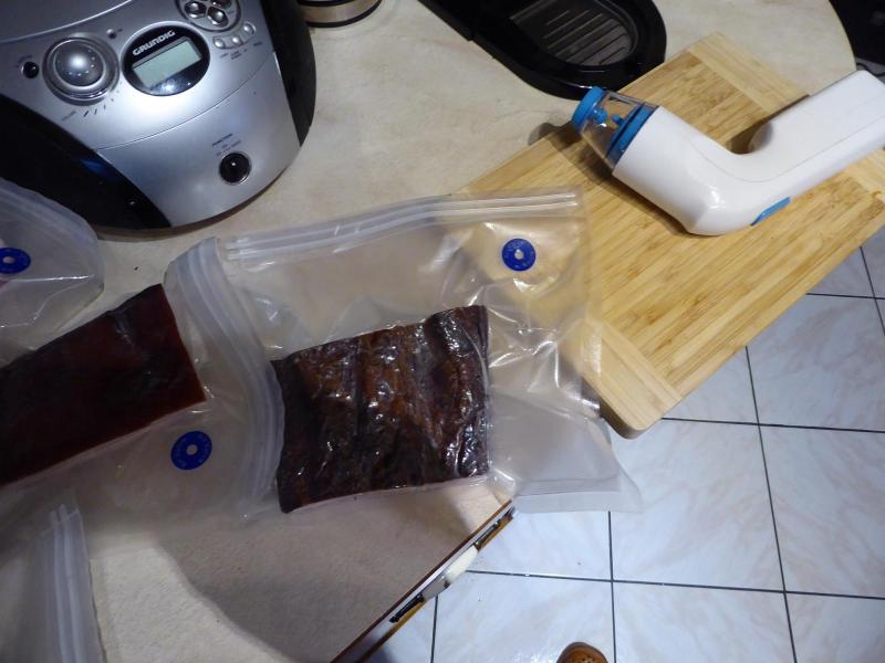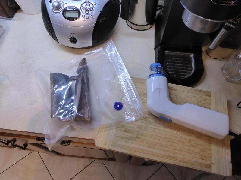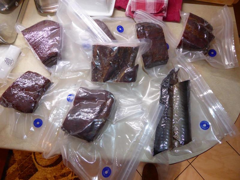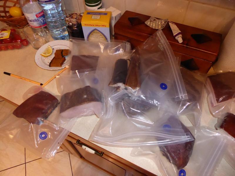 Święta, święta, i po świętach.... A często zostaje po nich różnych wędzonych umyślnie specyjałów, i... ambaras co z nimi zrobić ? Dzieci obdzielone, i gałgany więcej zabrać nie chcą , a tu jeszcze tyle zostało, samotrzeć zjeść się szybko nie da... No,można oczywiście urządzić mega imprezkę dla znajomych, i w ten sposób nieco "zejdzie" , ale po świętach pewnie wszyscy dookoła maja podobny problem, i idą na dobrowolną dietkę... Nie ma rady , trzeba przechować dłuższy czas, tyle, że lodówka niestety na tak długo nam nie przechowa. Mniejszy ból głowy kiedy mamy do dyspozycji jakąś chłodną(ale koniecznie przewiewną) komórkę, tam mogą spokojnie wisieć nawet i miesiące przy okazji dojrzewając i nabierając jeszcze finezji (np wędzonego węgorza nie powinno się trzymać w lodówce nawet do szybkiej konsumpcji, bo dużo on traci na swym świeżym delikatnym smaku, i oczywiście wysycha) Więc kiedy mamy do dyspozycji tylko zamrażarkę to już trudniej. Każda gospodyni ma oczywiście swoje sposoby, a ja chciałbym polecić Wam do długotrwałego przechowania w zamrażarce "pakowanie próżniowe". Próżniowe oczywiście w cudzysłowie, bo z torebek z podwójnym strunowym zamknięciem w które wkładamy nasze wędzonki (czy inne specyjały) wypompowujemy tylko powietrze. Używam do tego takiej kupionej (bodaj w Lidlu) pakowarki, ale oczywiście można innych z podobną zasadą działania Ma ten sposób tę zaletę, że nie następuje wtedy tak typowa dla długiego mrożenia utrata wody która powoduje wysuszanie mięsa, A po rozmrożeniu, nawet po kilku miesiącach, wędzonki są praktycznie tak świeże i soczyste jakbyśmy je dopiero co tam włożyli (sprawdzone wielokrotnie, daję słowo!). I w dodatku zajmują mniej miejsca w zamrażarce, a worki są wielokrotnego użytku i w różnych rozmiarach. Przechowuję w ten sposób także wędzone węgorze z podobnym skutkiem po ich rozmrożeniu, W takiej formie można je spokojnie przechować w zamrażarce długi czas bez zauważalnego uszczerbku dla smaku wyciągając kiedy potrzeba... Także inne rzeczy, jak bigosy, obrane z kości mięso pozostałe po ugotowaniu bulionu czy wywaru z którym nie bardzo wiadomo co zrobić, a które uzbierane potem świetnie nadaje się na pasztet, nawet gęstsze zupy jak domowa grochówka na (własnoręcznie wędzonym ) boczku, albo pozostałe po skrojeniu boczku skóry, które potem podłożone pod mięso doskonale zabezpieczą nam pieczeń przed przywarciem do rondla... I problem z głowy...