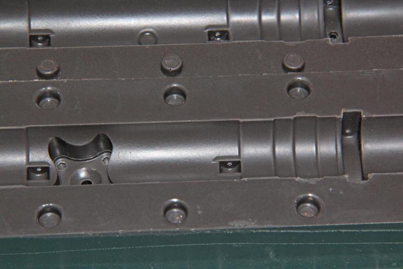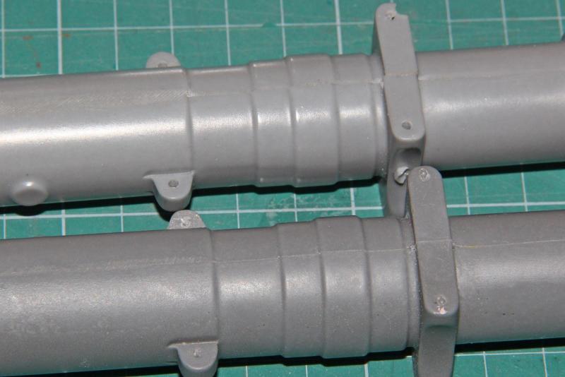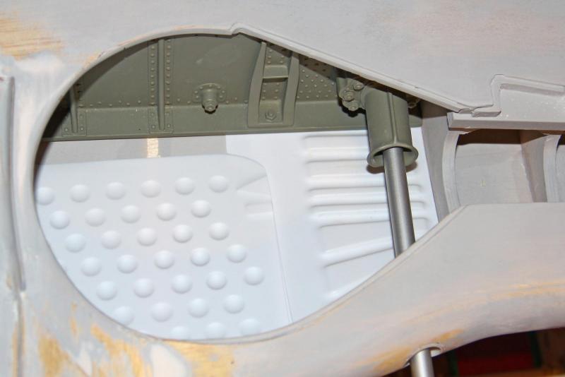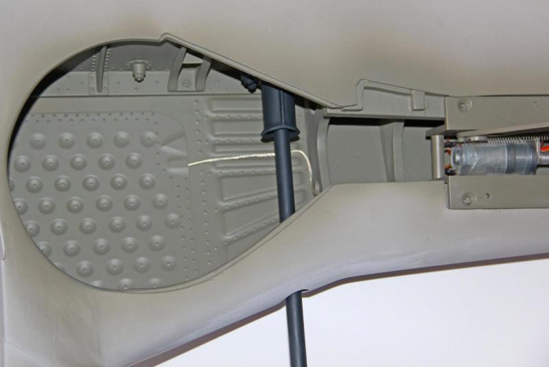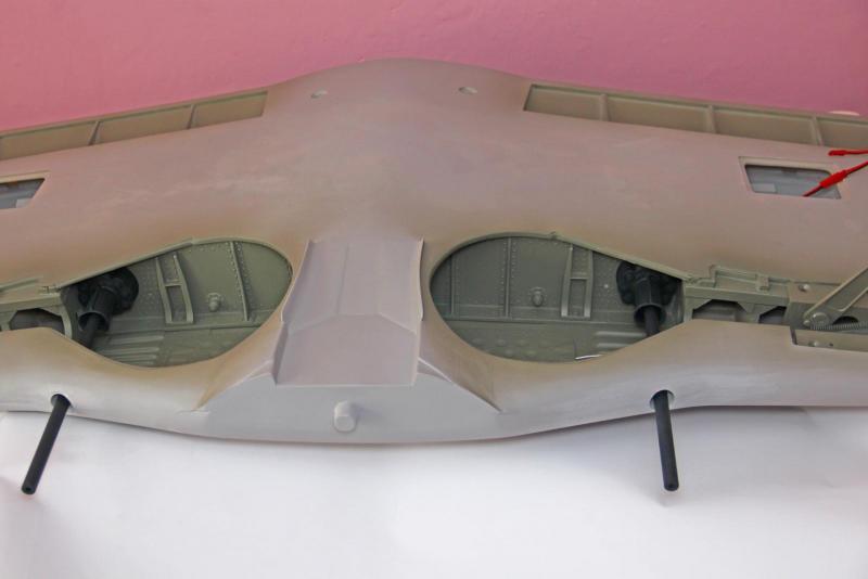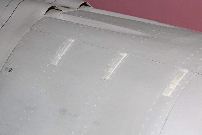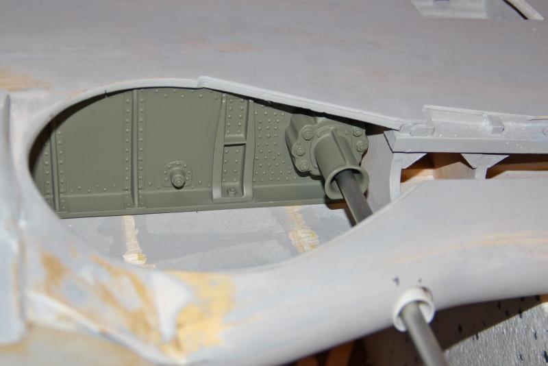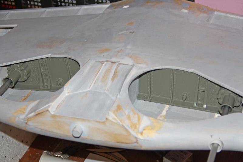 Ostatnio wykonałem ruchomą żaluzję, ponieważ wklejona na stałe kilka razy się uszkodziła. Przykleiłem osłonę karabinów, rurki do spryskiwacza, wykonałem linie podziału blach na kadłubie i zacząłem nitowanie.