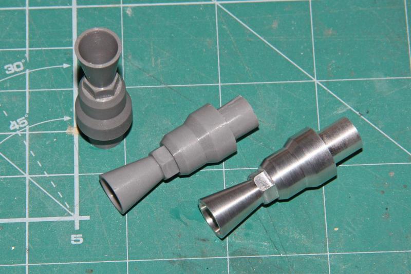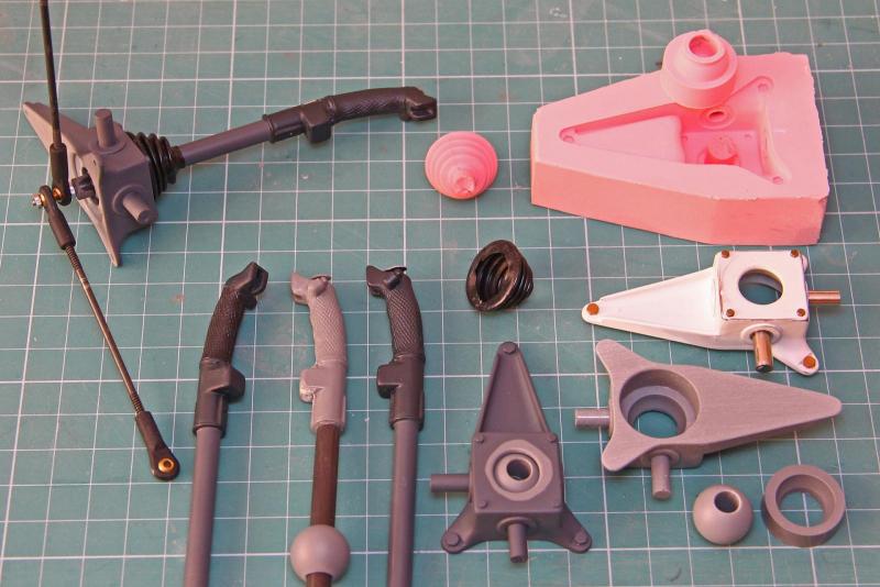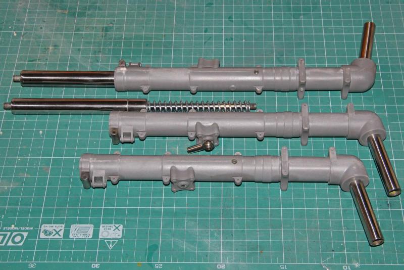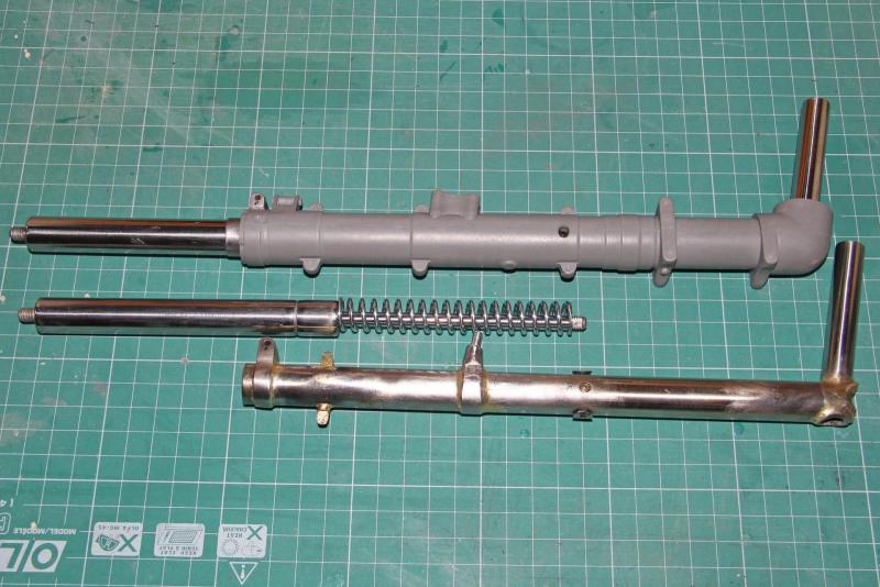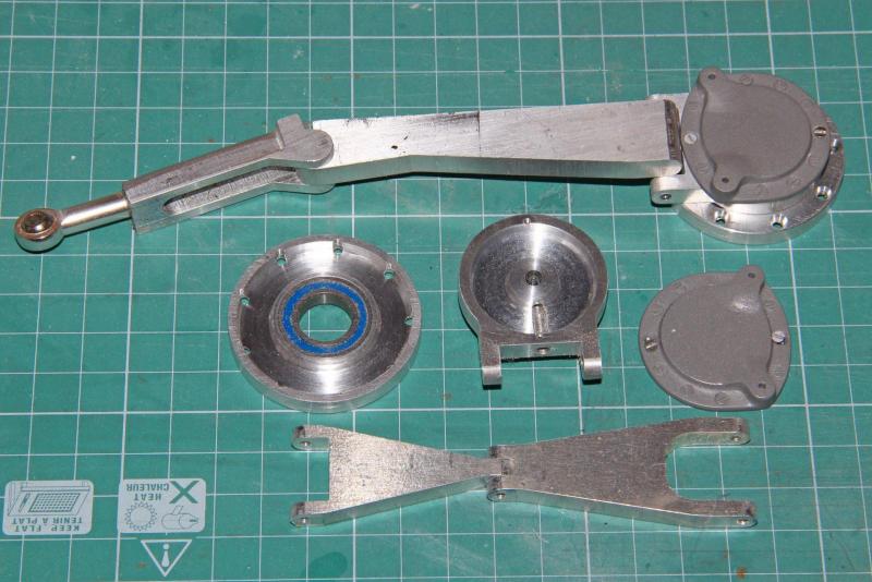 Postanowiłem wykonać nowe podwozie, ponieważ poprzednie było wzorowane na modelarskim i już mi się nie podoba, a nowe ma wyglądać jak oryginał, podzielę się więc tym co już zrobiłem. Goleń podwozia wytoczyłem z aluminium i przykleiłem kilka szczegółów, z tak powstałego kopyta odlałem formę. Tym razem wykonałem formę z elastycznej żywicy poliuretanowej, http://www.progmar.sklep.pl/ur-5863-1kg-a-0-74kg-b-0-26kg-p-111.html dzięki temu forma ma o wiele większą sztywność niż silikonowa, ale jest dostatecznie elastyczna tak by wyjąć z niej gotowy odlew, natomiast wadą jest konieczność stosowania rozdzielacza. Postanowiłem zrobić golenie podwozia stalowe, wyfrezowałem pierścienie do mocowania wahacza i ramienia wciągającego podwozie i przylutowałem je do rury (średnica zewnętrzna 16mm wewnątrz 15mm). Tak wykonaną goleń włożyłem do formy i zalałem żywicą, po wyjęciu z formy mam makietową goleń. Wcześniej wykonałem amortyzator olejowy, to znaczy zastosowałem gotowy od mebli, musiałem tylko dolać trochę oleju, dokupić sprężynę i wykonać pierścień mocujący popychacz tłoka. Zastosowana sprężyna pozwala uzyskać 5 cm skoku. Jedna goleń zapasowa. Tak wyglądają odlewy, ten wyżej z formy silikonowej niżej z formy żywicznej. Jak widać na zdjęciu forma silikonowa jest zbyt elastyczna i powstają przesunięcia na styku połówek formy. Ramię chowające podwozie.