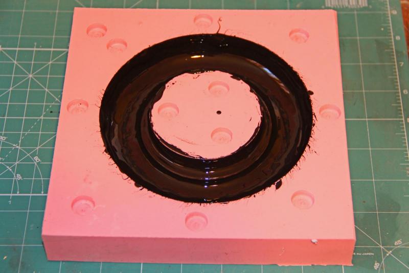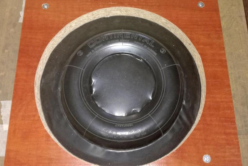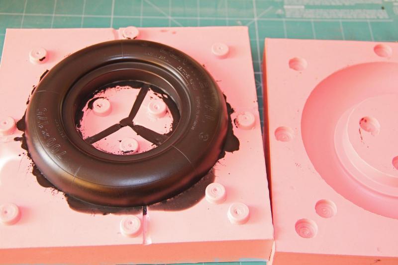 Nakładam jedną warstwę flexane na bieżnik grubiej, po zgęstnieniu tak by nie spływał, wlewam piankę i zamykam formę, pianka pęcznieje i przykleja się do flexane. Wybrałem flexane 94L ze względu na czas schnięcia 10 minut i wytrzymałość. http://www.devcon.com.pl/materialy-gumopodobne.html Pianka której użyłem to eko proflex 140 http://www.progmar.sklep.pl/proflex-140-elastyczna-c-24_65.html