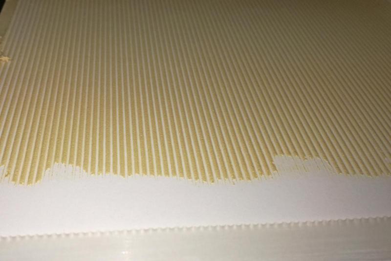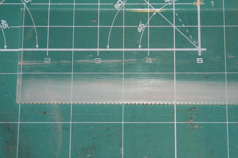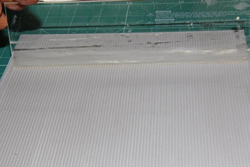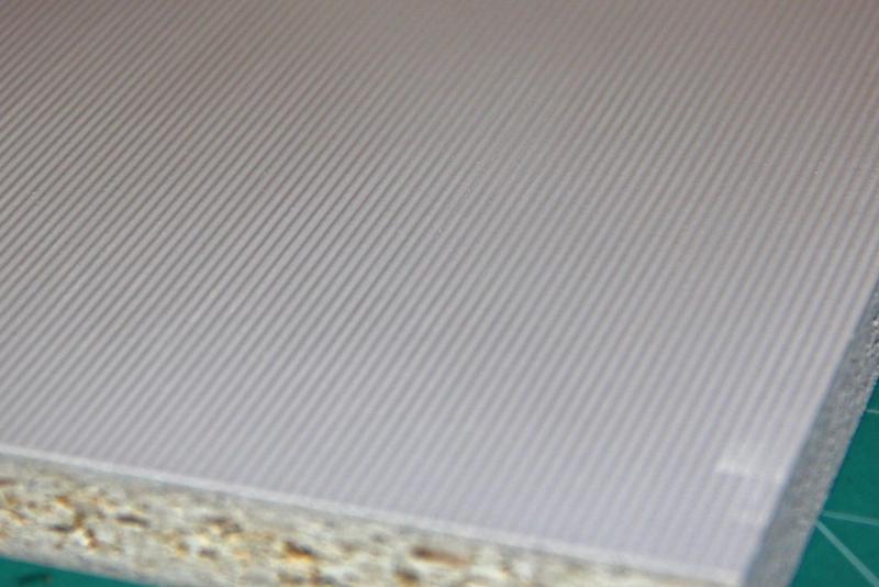 Patryk święci garnków nie lepią, specjalnie dla Ciebie narysowałem i wyciąłem grzebień z plexi następnie nałożyłem szpachlę na płytę i przeciągnąłem grzebieniem i jeszcze warstwa podkładu aby wygładzić szpachlę. Wykonanie formy zajęło mi około 10 minut. Na formie można wylminować blachy na cały model, ale trochę to potrwa. Można również wytłoczyć z HIPS-u na stole próżniowym, myślę że w godzinę mielibyśmy wszystkie blachy. Drugi pomysł to zrobienie walcarki, można zlecić tokarzowi wykonanie walców i walcować blachy faliste z cienkiego aluminium.