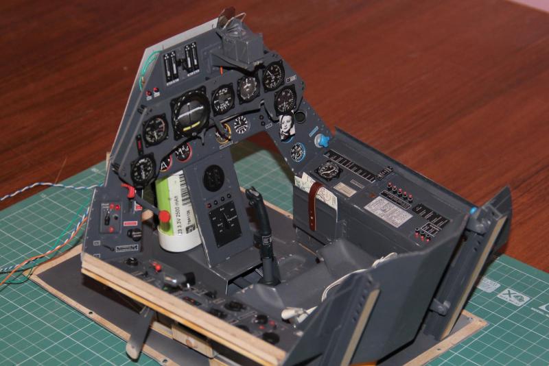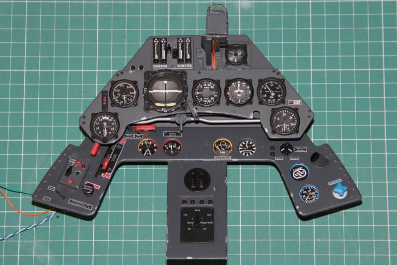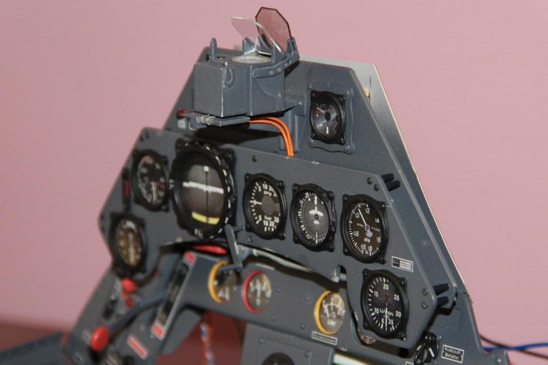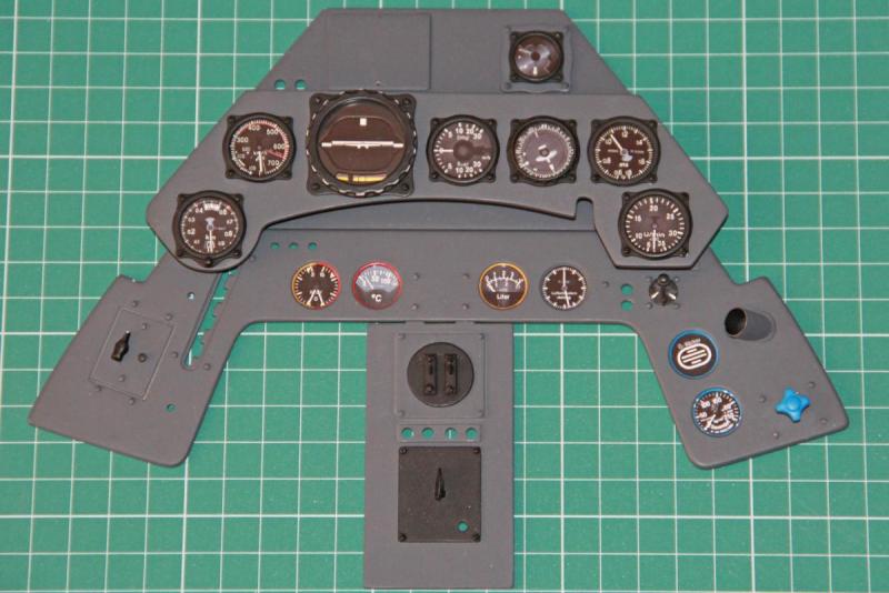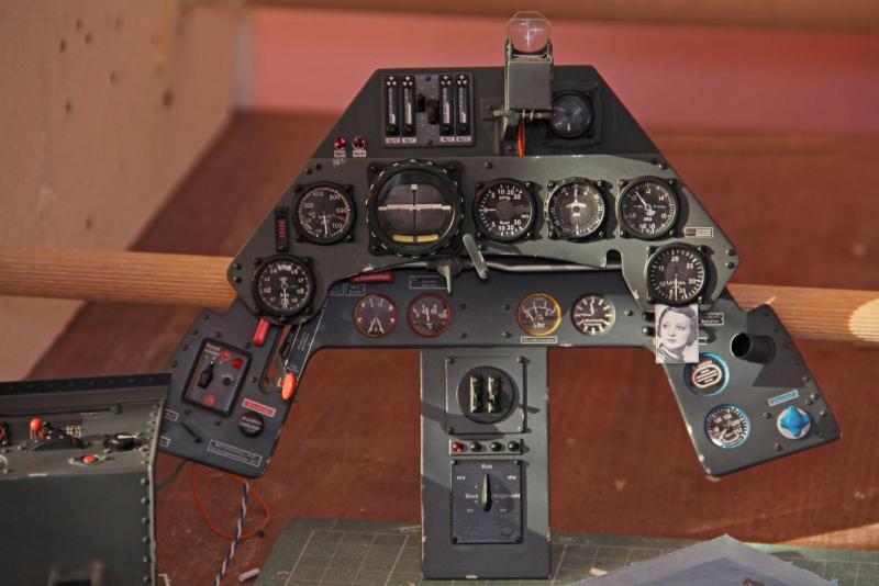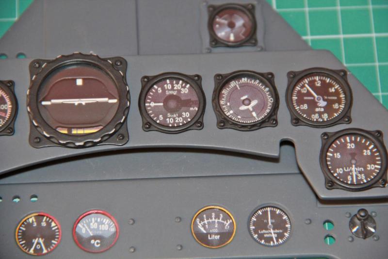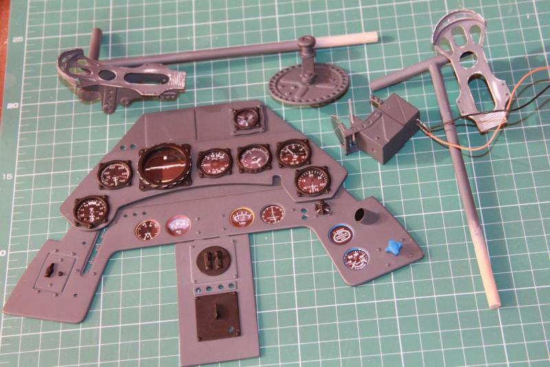 Drobna poprawka i nowa felga wycięta i pomalowana Tablice z przyrządami gotowe, brakuje jeszcze kilka szczegółów, pozostałym wyposażeniem kokpitu zajmę się później, a teraz muszę się zmierzyć z owiewką kabiny. celownik revi 16 B i nawet działa zdjęcia z prac przy kokpicie