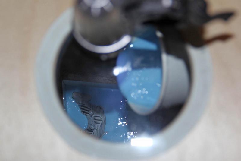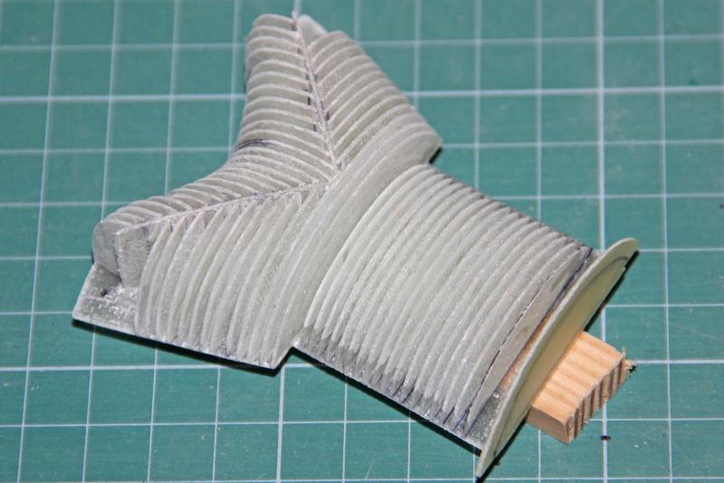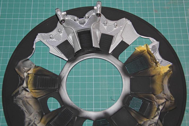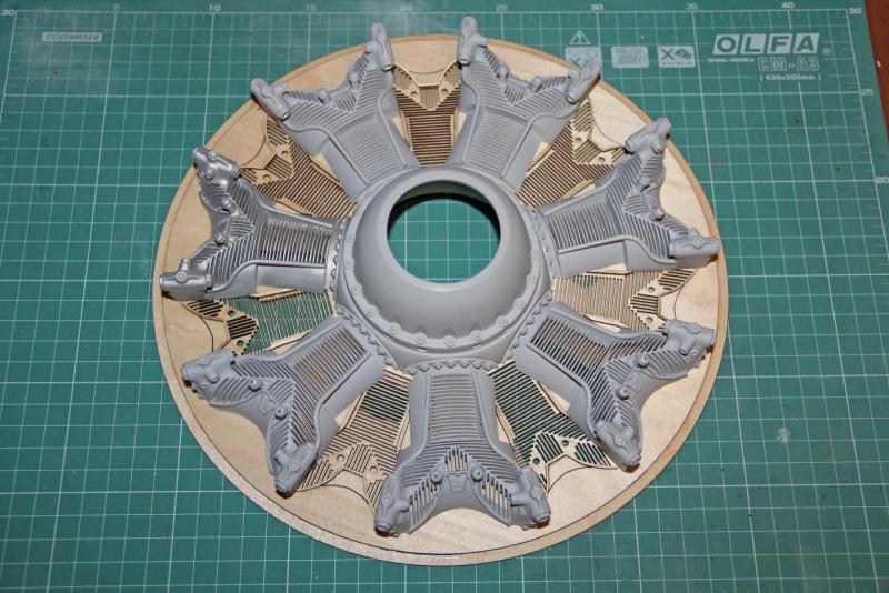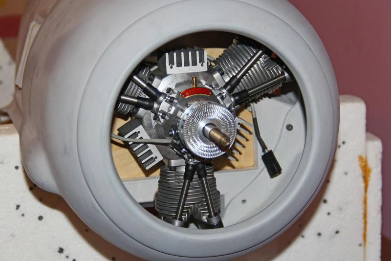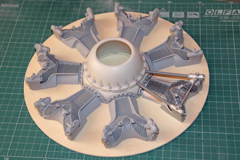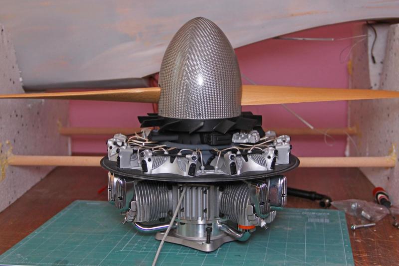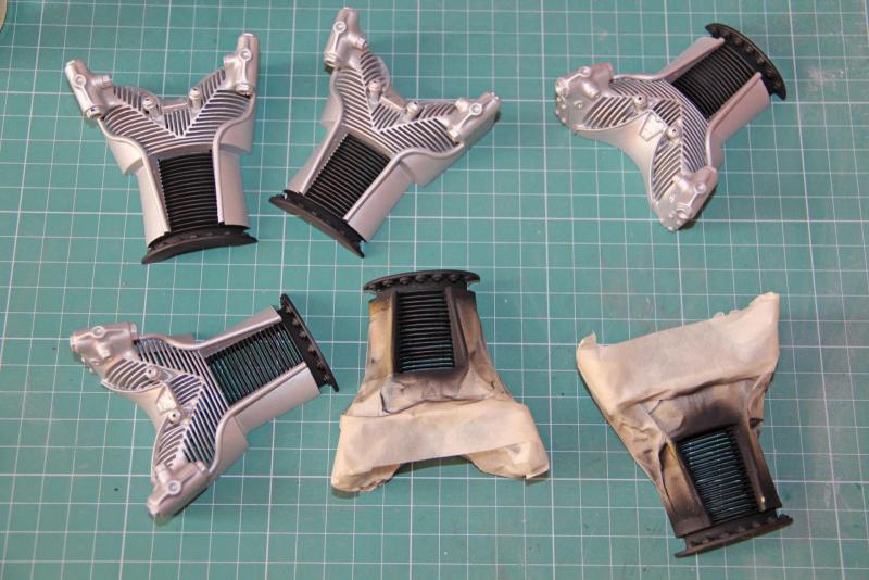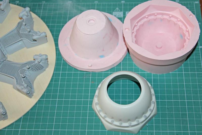 Atrapę silnika miałem sobie zostawić na zimę, ale najpierw postanowiłem tak na próbę wykonać cylinder i przykleiłem żebra z laminatu po oszlifowaniu, wygląd zachęcił mnie do przyklejenia kilku szczegółów i tak prototyp stał się wzorcem do wykonania formy Odlewy wykonuję w komorze próżniowej widziałem na RCSB, że drugi rząd cylindrów jedni malują inni wstawiają zdjęcia, mój będzie wycięty laserem myślę, że taka ilość powietrza , która przejdzie przez ten cylinder wystarczy do chłodzenia właściwego silnika niestety, jest za mało miejsca między cylindrami a wentylatorem i nie zmieszczę urządzeń znajdujących się na bloku silnika.