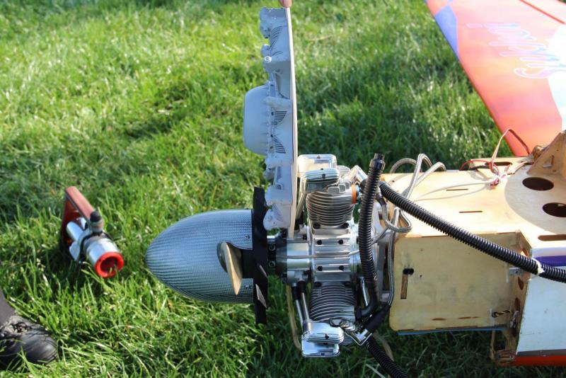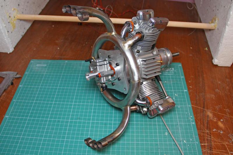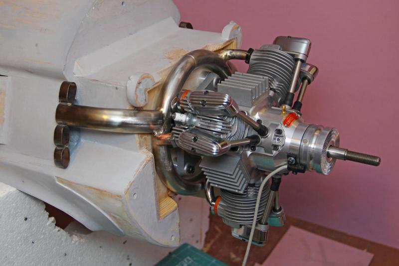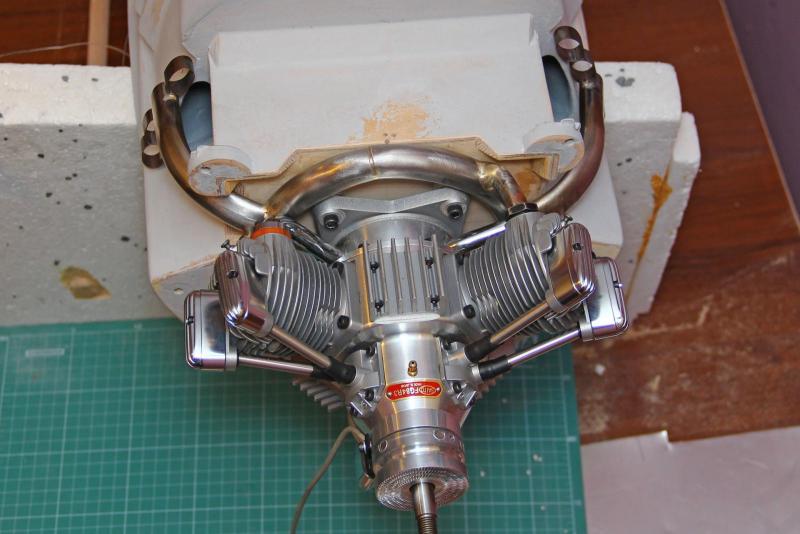 Silnik wstępnie dopasowany i zamontowany w modelu Znalazłem filmik z tłumikiem firmy Keleo, można tu porównać brzmienie silnika Saito FG84R3 z tłumikiem i z standardowymi rurkami. Dźwięk silnika z zamontowanym tłumikiem jest rewelacyjny, przypomina silnik Moki, cena 195 dolarów plus koszty transportu i cła to około 1000zł , mimo dźwięku silnika nie dam tyle za kawałek rurki a tak wygląda mój tłumik za 150zł. tłumik wykonałem z kupionego w markecie stojaka łazienkowego.