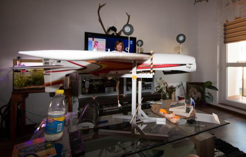 Witam wszystkich po dłuższej przerwie. Otóż panowie, po prawie 3 latach postanowiłem powrócić do czynnego modelarstwa RC. Dawno temu kupiłem sobie model Multiplexa, dokładnie chodzi o Tucana. Jako, że wracam do gry postanowiłem go złożyć. Wszystko szło ładnie i pięknie do czasu wyważenia. Kilka dni temu zrobiłem sobie nawet specjalną wyważarkę (własnej konstrukcji) Do sedna... Ustawiam model na wyważarce, na miarkach mam po 90 mm (liczone od krawędzi natarcia zgodnie z instrukcją) Reguluję środek ciężkości pakietem, wszystko ładnie, model pięknie leży na podporach. Zdejmuje go z wyważarki, kładę po raz kolejny...w tym momencie wychodzi"zonk" (model wydaje się być nie wyważony) i tak w kóło, co wyważę, zdedjmę, zawsze robi się kiła. Reasumując, za każdym razem kładąc go na wyważarce muszę powtarzać czynność regulacji położenia pakietu. Dodam, że całe wyposażenie modelu jest dobrze rozlokowane w kadłubie, serwa są takie same itd. itd. Nie uważam się za totalnego laika, trochę się już latało, trochę modeli rozbiło Także aż głupio zwracać się do was z takim problemem. Dodam, że nigdy wcześniej nie miałem w rękach żadnej profesjonalnej wyważarki... może rurki które mają styczność ze skrzydłem są po prostu za wąskie, i byle mm odstępstwa psuje pierwotne wyważanie... sam nie wiem. Zawsze czynność wyważania wykonywałem na palcach i wszystko było ok (teraz postanowiłem zbudować do tego dokładny przyrząd i nie potrafię wyważyć modelu) Kilka zdjęć mojego ustrojstwa znajduje się poniżej P.S Byłbym wdzięczny za pomoc, co zrobiłem nie tak