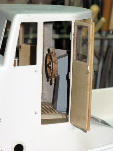 Serdecznie witam. Klimek w budowie – cd. Zgodnie z harmonogramem budowy, realizowana jest zabudowa sterówki. Drzwi wejściowe do niej są zrobione (klamka ruchoma i jest oszklenie). Zabudowa wnętrza jest w toku. Stan początkowy mają: schowki, siedzisko (kanapa), mechanizm koła sterowego, greting wewnętrzny oraz konsola busoli. Szczegóły zostaną dopracowane. Sporo pracy wymagać będzie wykonanie deskowanej podłogi oraz oszklenie całej sterówki wraz z obramowaniem zewnętrznym. Ale to jest przede mną. CDN… -
