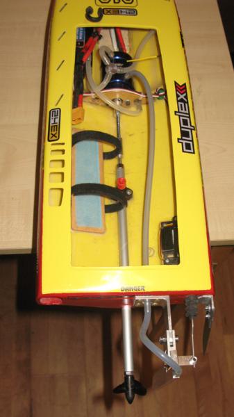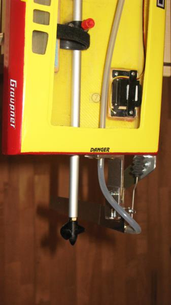 Michał - tak jak podał Andrzej, ale dodam: kadłub dokładnie ma 740 mm. Zestaw napędowy: silnik rcb brushless motor (firma fsd www.fsd-motor.com)) typ F-450B, 460W, 3000kV, zasilanie 3-4s Lipo lub 9-12 cel NiMh, prąd max. 38A, średnica 28 mm, waga 55 g, napędza śrubę o średnicy 32 mm poprzez wał elastyczny.