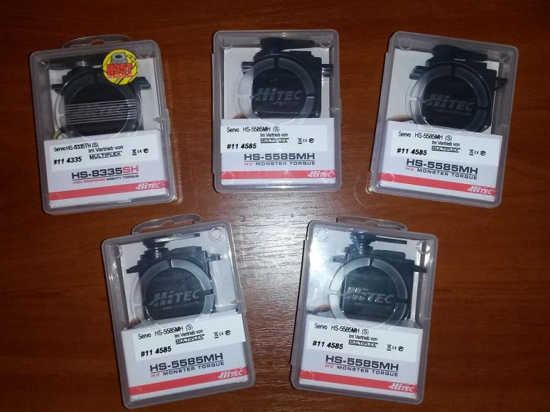 Niektórzy twierdzą, że masa modelu x2 na powierzchnię, czyli do tego Su po 10kg na lotki, 10 kg na kierunek i 2x5 kg na wysokość. W związku z nawracającymi dyskusjami o serwach przejrzałem jeszcze raz ofertę Hiteca (bo już po wszystkich producentach "latać" mi się nie chciało). Najsłabsze serwo HV, mające min.5kg siły, metalowe zębatki i podwójne łożyskowanie to 5665MH. Ma wymiary i wagę identyczną jak 5585MH, które kupiłem. Jest 50zł tańsze i ma 10kg vs 17kg w tych moich. Także zakupu nie żałuję, serwa zapewne przeżyją model.