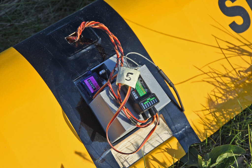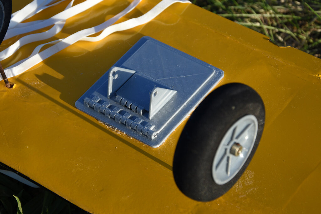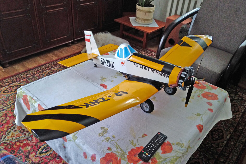 Wyważenie to spory problem w modelu tego samolotu. Nasz to elektryk a to wiadomo silniczek stosunkowo lekki. Z takim Saito będzie pewnie łatwiej. Pierwotnie imitacja gwiazdy była balsowo-sklejkowa, teraz w czasach druku 3D Dromader otrzymał solidny wydruk z PLA i jest dużo lepiej a i sam silnik wygląda lepiej. Jak byśmy budowali go raz jeszcze to wydłużył bym przód o kilka centymetrów. Co się da montować maksymalnie z przodu. Poeksperymentujemy jeszcze z kątem zaklinowania płata bo na to też Dromader jest czuły. Przy okazji uwaga - jak ktoś zechce budować ten model z czeskiego planu niech koniecznie zmniejszy wznios bo model projektowano bez lotek. Dziś nie udało się polatać bo dość mocno wiało a takie eksperymenty lepiej w masełku przeprowadzić może jutro będzie lepiej. Co do testów środków gaśniczych to zamierzamy załadować jeszcze jak pisałem ryż i kaszę manną a do tego doszła kasza jaglana i wiórki kokosowe?. Wiem brzmi śmiesznie ale w stosunku do trzech poprzednich są bardzo lekkie i mogą dać fajny efekt. Na klapę do zrzutu też trzeba uważać bo można się zdziwić jak na otwarcie model zareaguje. Nasza ma w środku dziurę by nie stawiała oporu oraz by wywiało odpowiednio zawartość. Specyfikacja naszego modelu: Rozpiętość 1200mm Masa startowa 1,3 kg z akumulatorem i ładunkiem Silnik Tunigy 3530/1100 kV śmigło APC 11/6 (było to duże 4-łopatowe z GWS 10/8 ale odleciało z piastą na modelarni przy próbach) Pakiet 1800 mAh 3S.