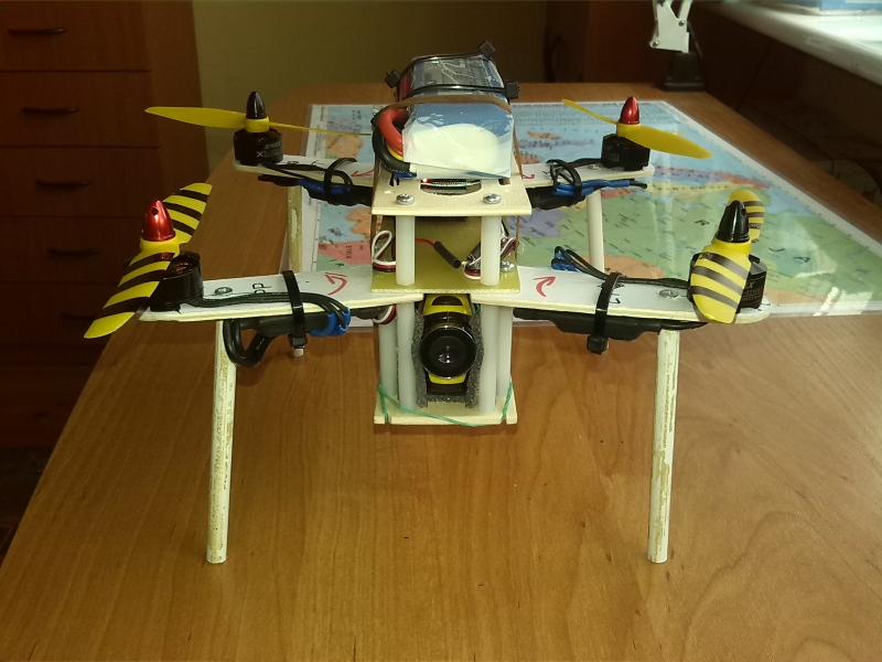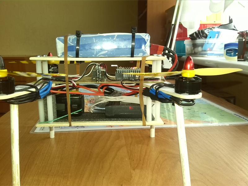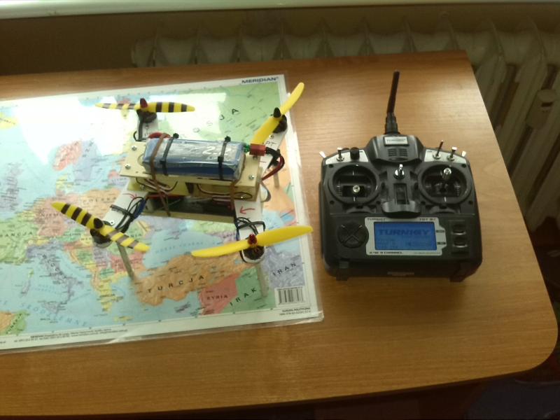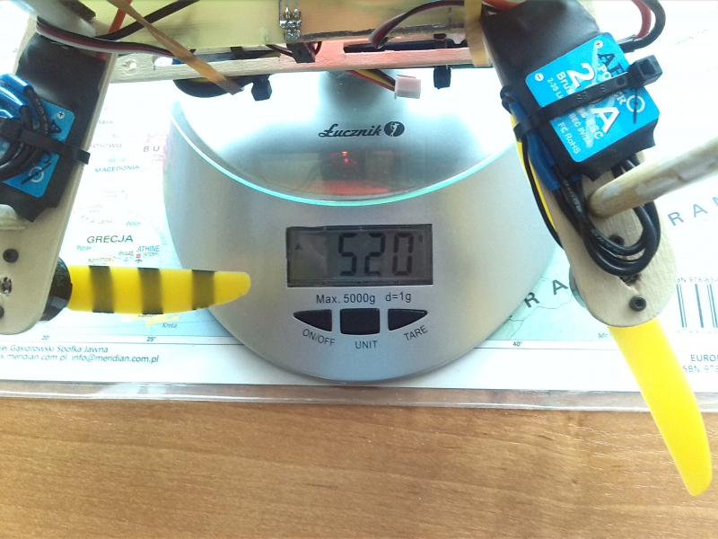Witam, właśnie skończyłem składać swojego pierwszego wielowirnikowca Setu: emax'y mt1806 kv2280 5x 3 gemfany ecs 20A abc power wiem że wielkie ale jak ten poleci to chce je dać do większego Multiwii 2,3 na arduino pro mini z mpu6050 3s 2200mah na zasilanie, docelowo chciał bym 1600 TG NANO dla zbicia wagi DO tego kam denver ac1300hd, w przyszłości może fpv, ale to raczej na kolejnej ramie bo tym chcę nauczyć się latać. Rama zrobiona dosłownie z tego co w szfkach zalegało @_@ Od dołu Skl owocowa z pobl straganu - daje miejsce na rx orac kamerę 40mm wyżej laminat szkl/epok z wytrawionymi ścieżkami coby wszystko razem połączyć 25mm dyst. i kolejna wysokiej klasy półka rodem ze straganu warzywniczego z miejscem na lipo waga rtf 520, do poderwania bestia potrzebuje ok 40% gazu I tu zaczynają się schody..... pomimo kalibracji acc, oraz raczej małego jellow na nagraniu, Po poderwaniu z ziemi - jeśli gaz dodaje powoli to tył dostaje jakby więcej mocy i kończy się fikołkiem - przy zdecydowanym dodaniu gazu model wpada w rotacje w osi z, a że jedyne starty jak narazie były w mieszkaniu to nie wiem jak się maszyna zachowa jak będzie miejsca w górę więcej.... Ale z pid'ami zapewne jeszcze mnie czeka zabawa
