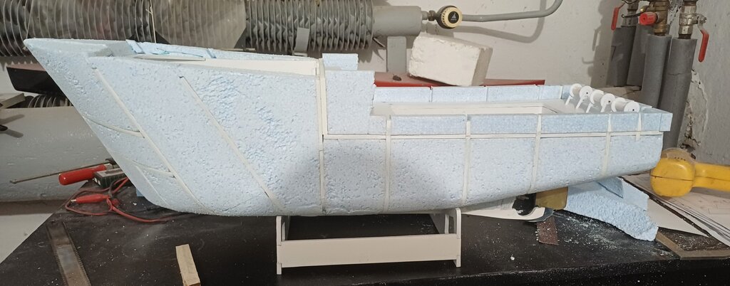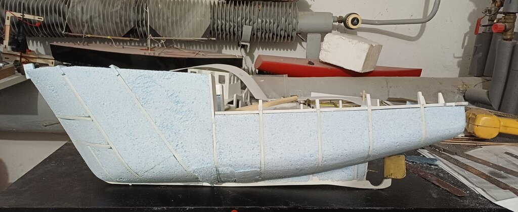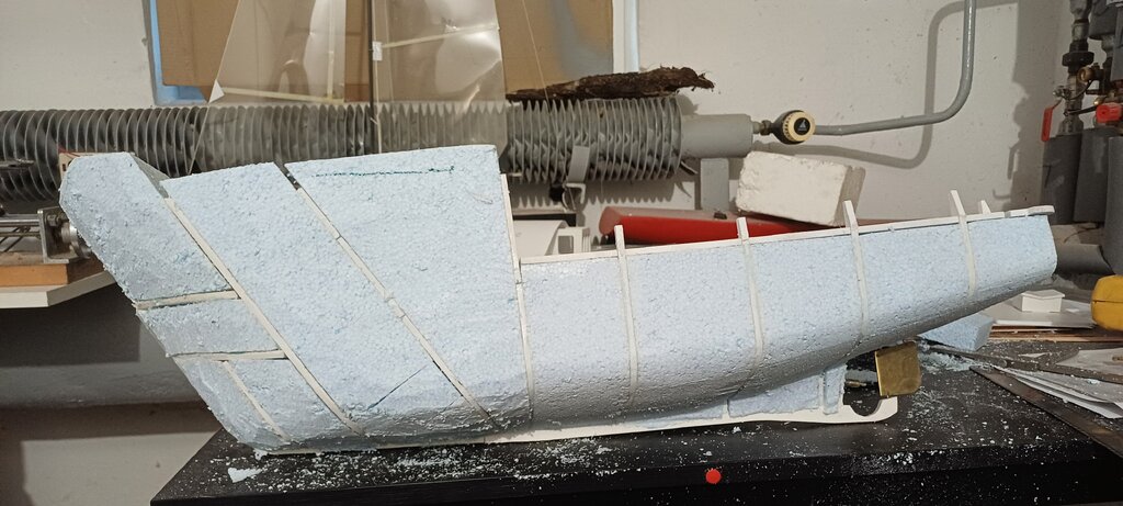 7. Po zrobieniu kilku drobnych prac, pozaklejałem nadburcie. Po wycięciu na drucie oporowym listewek ze styropianu, wklejanie poszło szybko.