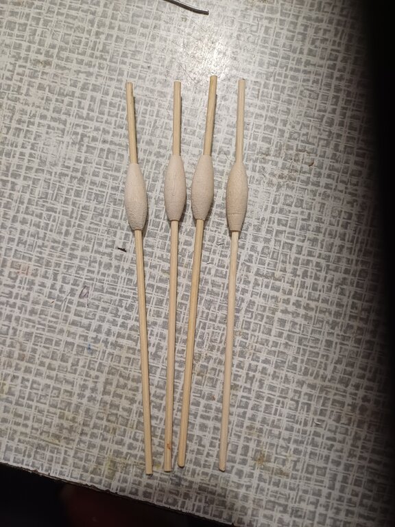 11. Po tygodniowej przerwie na wczasy nad morzem wróciłem do pracy nad modelem. Cały kadłub oklejony styropianem. Okazuje się, że styropian o tym kolorze jest dużo lepszy do obróbki. Może trochę cięższy od białego. Oszlifowany i przycięta linia nadburcia na dziobie. Doklejony styropian w zagłębieniu dla wyrównania powierzchni. Teraz przykleję dolny pokład i nakleję kawałki styropianu na nadburcie. Zacząłem toczyć pływaki boi rybackich. Trochę skomplikowane. Musi być kształt owalny i jeszcze przewiercone w zdłuż.