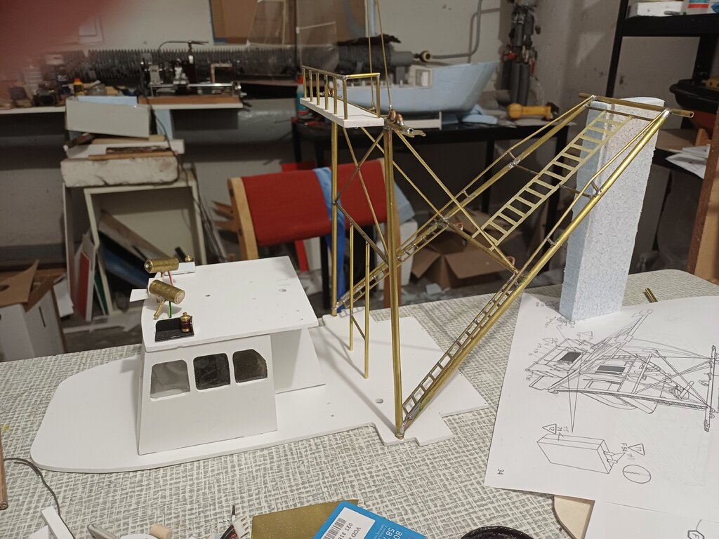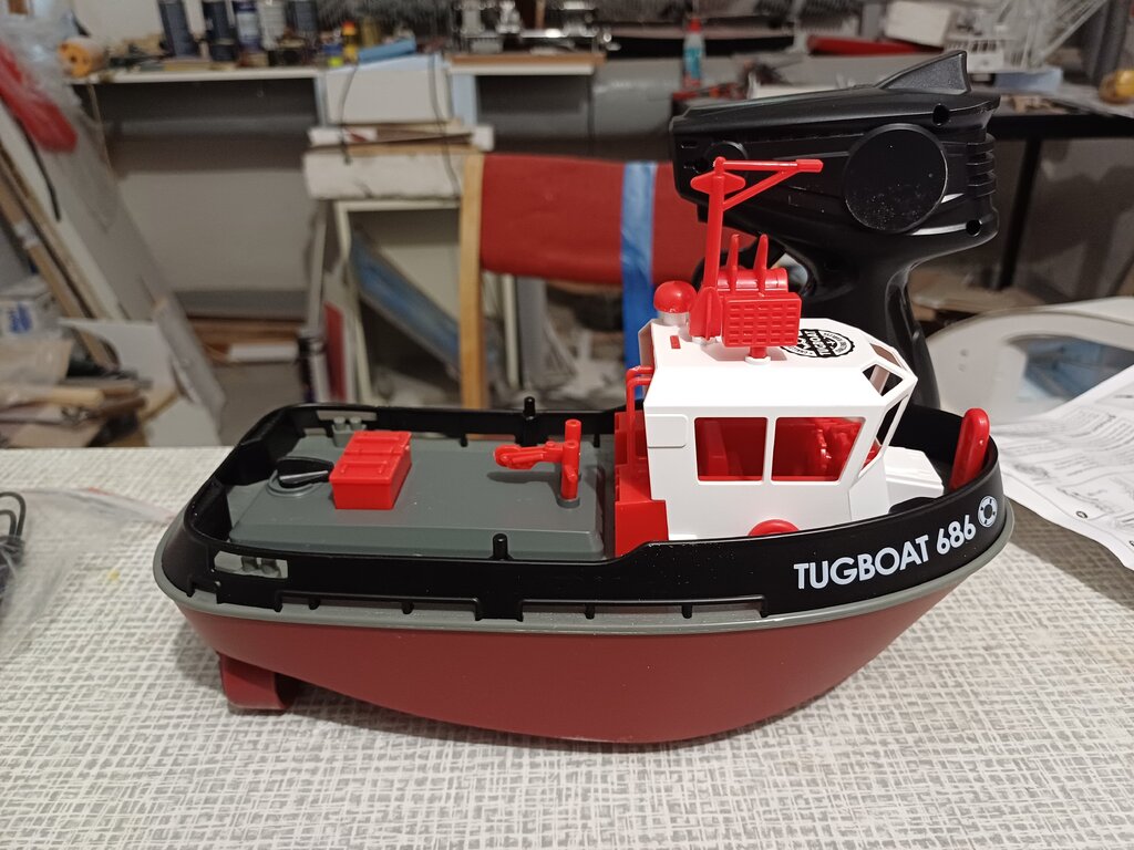 1. Kadłub Andrei szpachluję i szlifuję. Wczoraj kurier dostarczył paczkę. W środku zabawka. Model Tugboat 686 z Aliexpres. Kilka części powciskałem i próby. Zmierzyłem długość, 230,5 mm. Bardzo głośny napęd . Stery w lewą stronę trochę mniej się wychylają. Sterowanie proporcjonalne. Więcej na YT. Dzisiaj, jak będzie czysta woda w kanale, to będzie pływanie. Zdjęcie zrobione na szybko. Mam zamiar zrobić plany większego. Np. 500 mm.