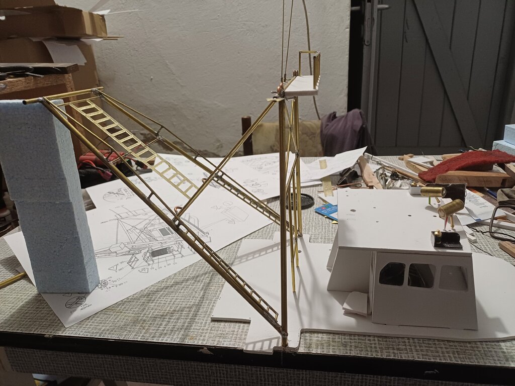 5. Zrobiłem, zlutowałem taką oto konstrukcję. 2,5 godz. Na końcu z prawej strony będzie rolka. Widać na planie. Do haczyków, pośrodku będzie przyczepiona linka opuszczająca i podnosząca oraz drążek stabilizacyjny, przód, tył.
