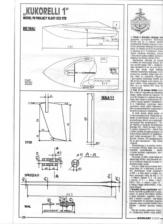 12. Silnik tak jak jest na planie. Komplikuje część dla załogi. Zastanów się jak umieścić serwo. Mikro np. SG 92 wystarczy. Lipol 5000mAh nie musi być. Wystarczy 2200.Nie warto obciążać. Dłuższe pływanie się znudzi. Mogą być 2 pakiety na wymianę. Umieść lekko z lewej strony przy obrotach w prawo patrząc z tyłu. Nie w prawo. Obroty w lewo. W prawo nakręca się śrubę na gwint i stąd ta pomyłka. Wyrównasz moment obrotowy. Ostatecznie wszystko okaże się na wodzie.