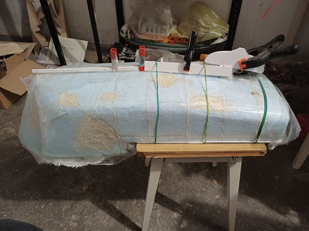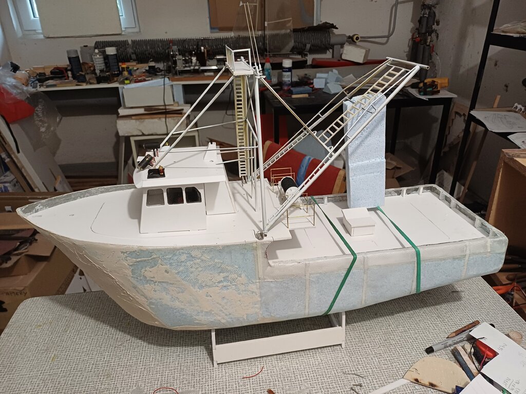 3. W kutrze Andrea Gail z budową skok do przodu Położyłem laminat. Jest pokryty cienką folią żeby łatwiej sprawdzać czy tkanina dobrze przylega. Szpachlówka samochodowa Finish wyżarła styropian i musiałem nałożyć drugi raz.