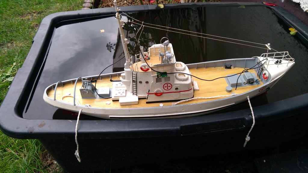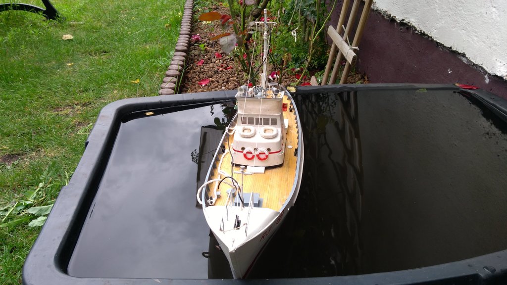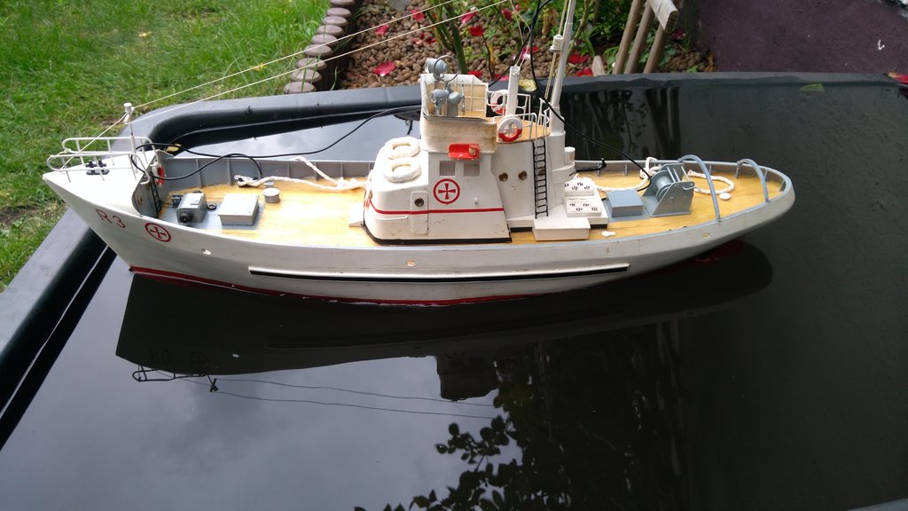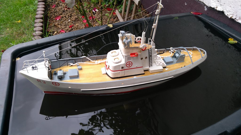 Dyżurny model na działce ROD, kuter ratowniczy R 3 zbudowany w 2011. Popływał na kanale. Wymaga remontu a przynajmniej czyszczenia. Pływał do zdjęć w korycie budowlanym na świeżej deszczówce. Poszycie ma zrobione nie z listewek tylko z pasków HIPS-u. "Przycumowany"