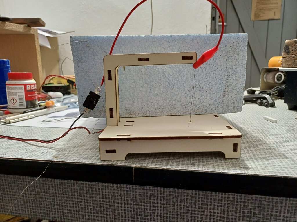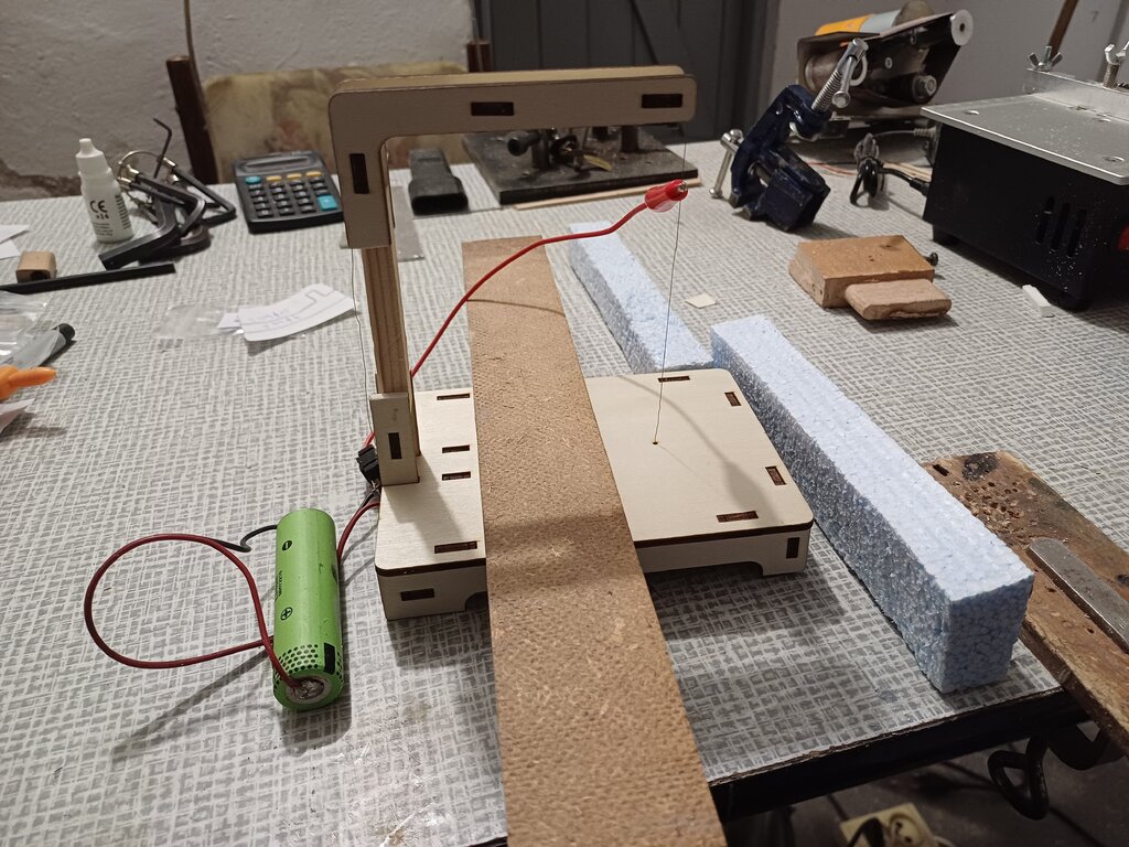 Kupiłem takie oto urządzenie do cięcia styropianu. Jak widać na zdjęciu ramię jest za nisko do tej grubości. Zrobiłem przeróbkę wydłużając słupek. Do zasilania wystarczy 1 li on.