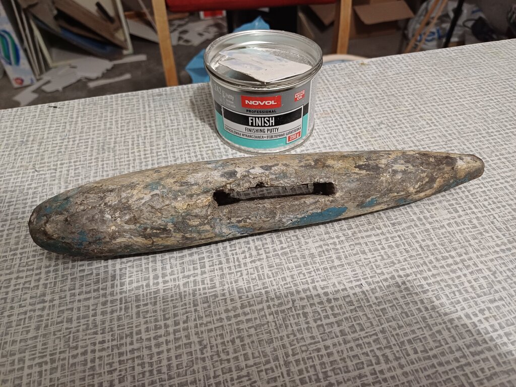 No i powinna być ta śruba mosiężna do takiego modelu. Całkiem fajny, przyjemny, nie skomplikowany. Byłem na skupie złomu. Była potężna bulba. Waży 2,5 kg. Dł. 250 średnica 44 mm. Od jakieś dużej żaglówki. Kupiłem. Na razie będzie leżała, nie przetopię. Kupiłem kawał blachy 2,5 mm. Jakiś stop ołowiu. Twarda, ciężka. Chyba w temperaturze topnienia ołowiu nie będzie się topić. W odpowiednim czasie potnę na prostokąty między wręgami i posklejam w stosy.