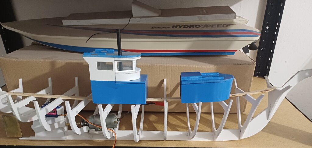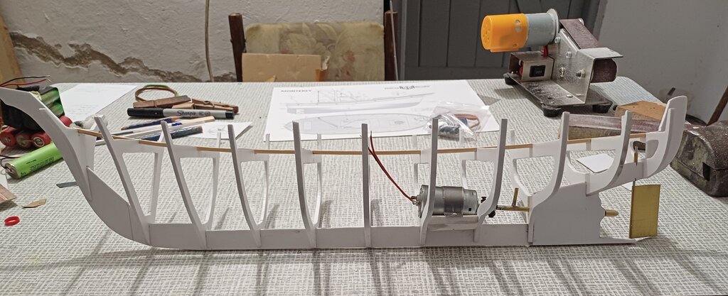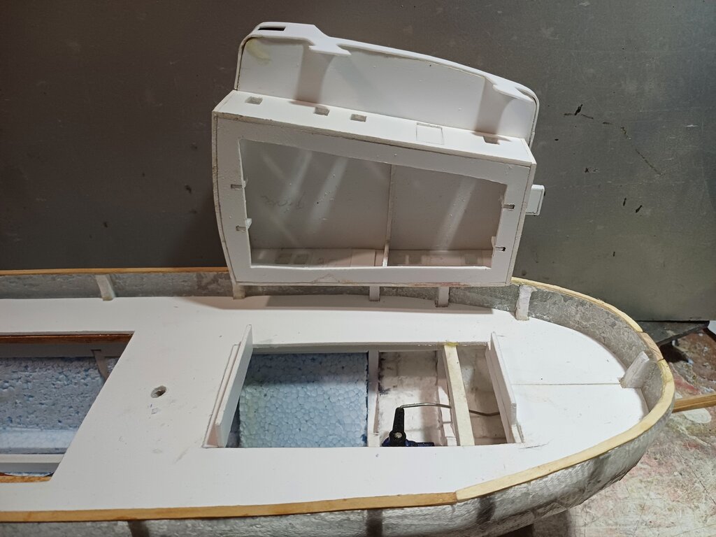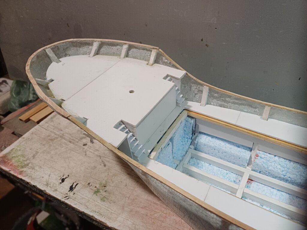 Nowy model. Kuter Monterey według instrukcji z Billing Boats. Na to miał być położony sklejkowy pokład co dałoby sztywność. Ponieważ robię metodą na styropian wstawiłem szeroką listwę wzdłuż środków wręg. Napęd jest. Sterowanie serwem też. Trochę trwało wymyślenie mocowania serwa. Kilka zejść do modelarni trwała budowa nadbudówek. Teraz czekam na przesyłkę przecinarki styropianu z Ali