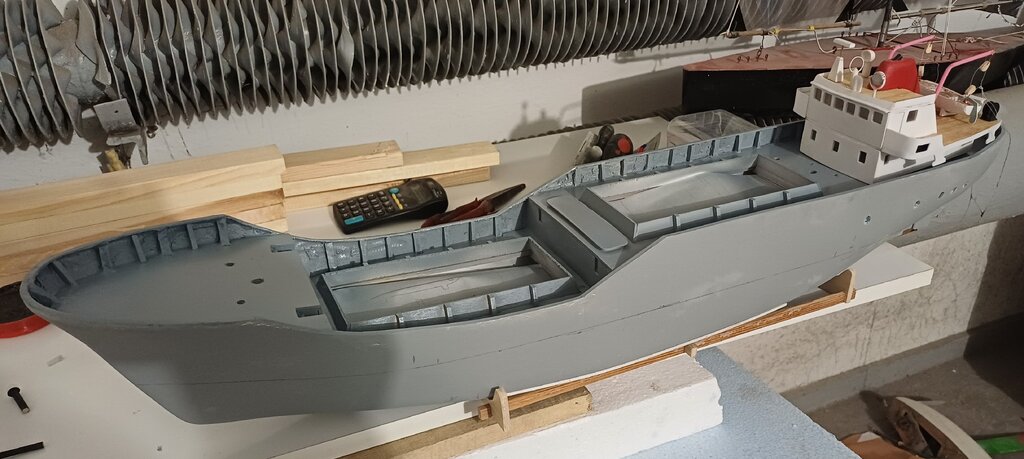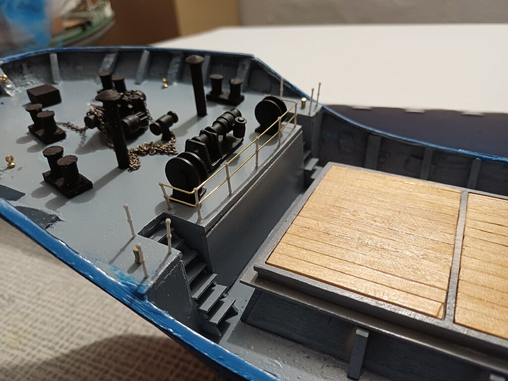 Pokład pomalowany na szaro. Wytoczone części do 2 wind dżwigów i 1 kotwiczna. To jeszcze nie komplet. -