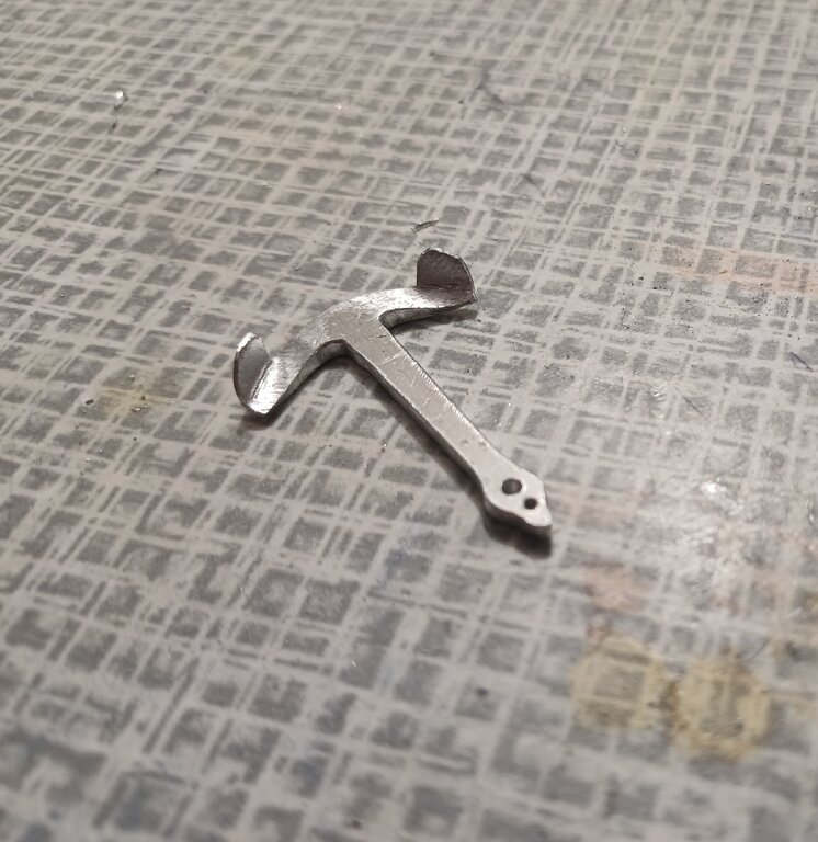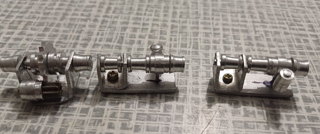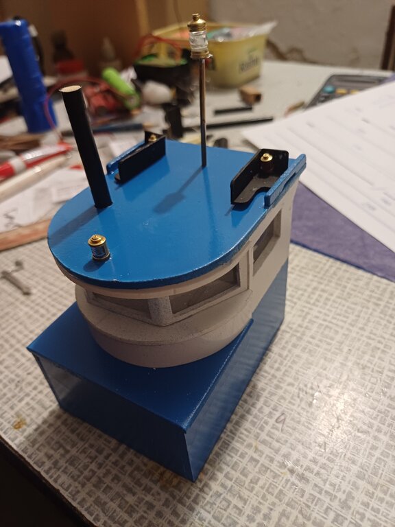 Nakładanie nadbudówki rozwiązałem w ten sposób Woda może dostać się do środka ale myślę, że nie dojdzie do tego. Zrobiłem schodki. Malutkie części ale jakoś wyszło. Zlutowałem w przyrządzie śrubę. Wyszła trochę za duża. Od wału w górę jest mało miejsca. -