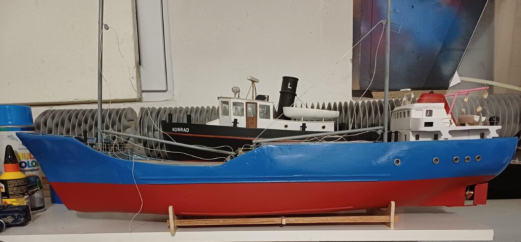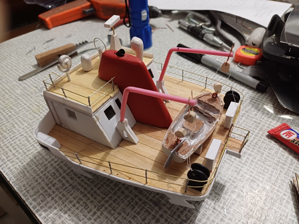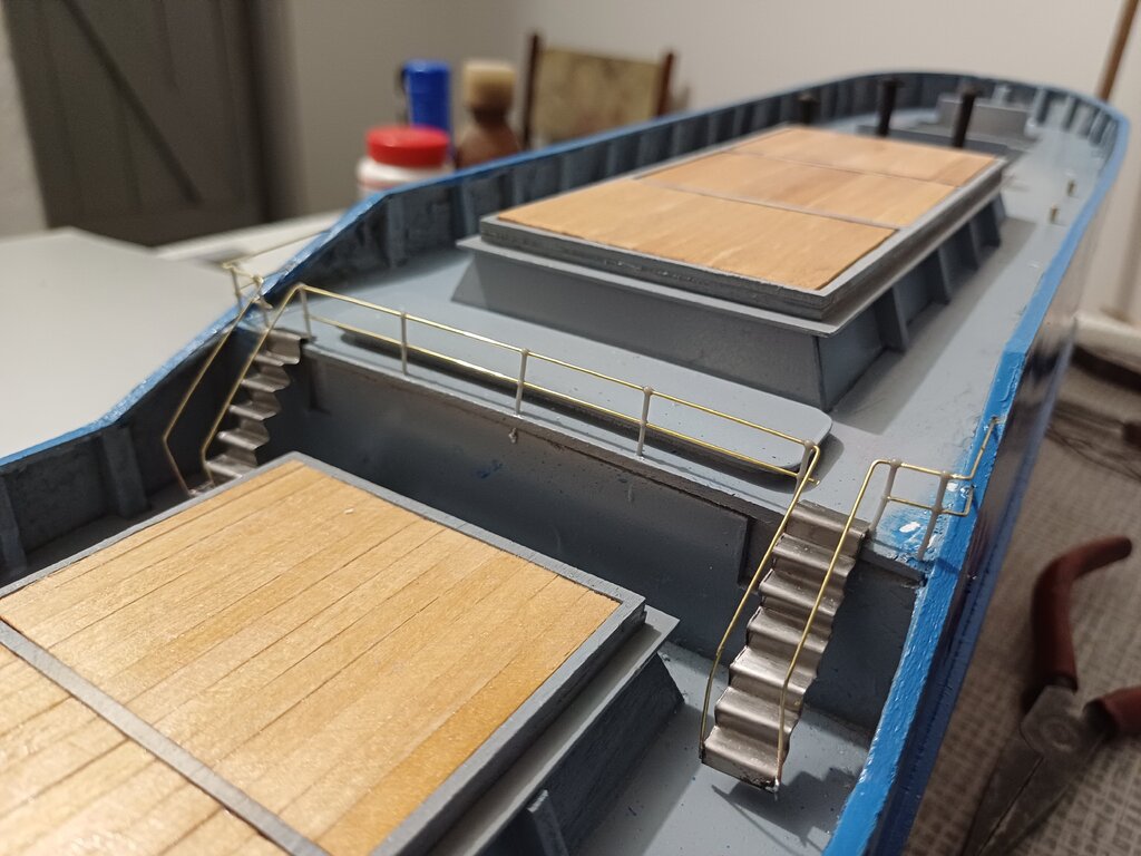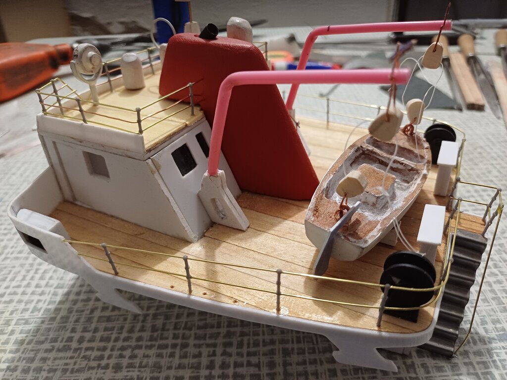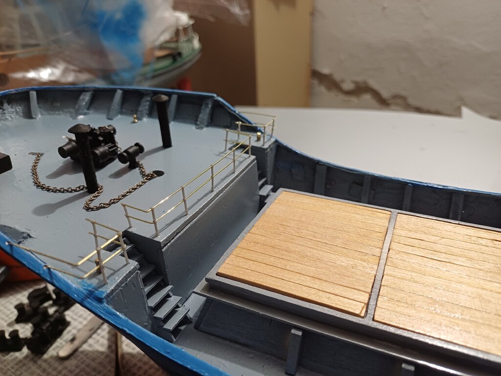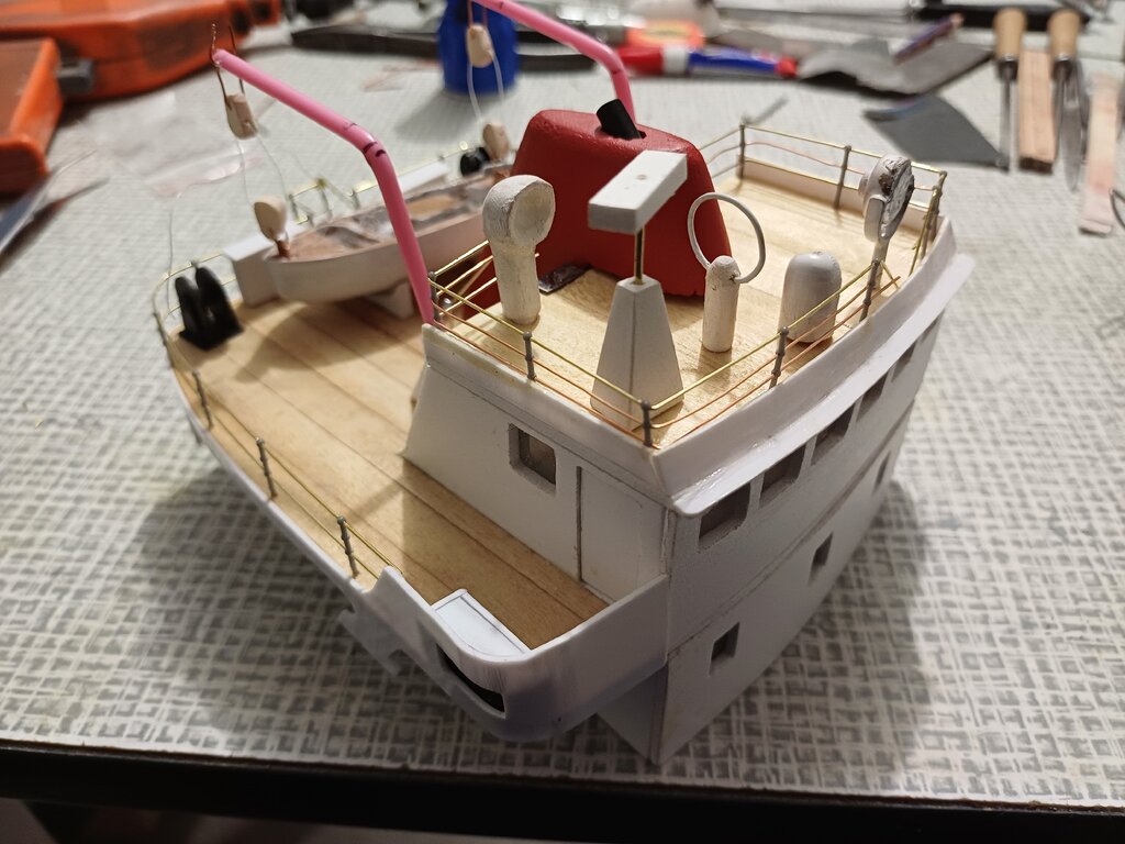 W modelu jest styropian. Widać na początku relacji. Prawie skończyłem relingi. Mozolna praca. Nie wyszły idealnie. Pozostało obcięcie końcówek, trochę klejenia i malowanie pędzelkiem. Ze schodkami poszedłem na łatwiznę. Pozostały do zrobienia relingi na nadbudówce. -