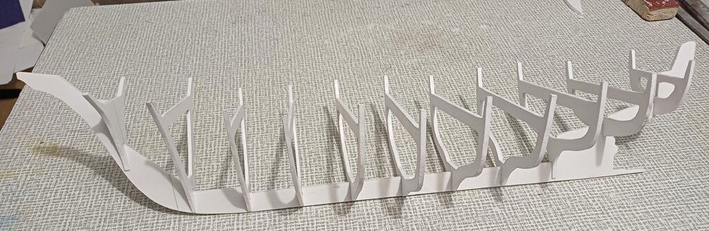 Tak, będzie odwodnienie dolnego i górnego pokładu, chociaż są różne opcje. Nie będzie pływał na dużej fali. I jeszcze 2 odbojnice ale to po malowaniu poniżej linii wodnej. Przeszkadzają w zaklejaniu taśmą. Model buduję według zestawu i dlatego co 3 wspornik nadburcia, od wręg, jest grubszy i pod niewłaściwym kątem. Potem pomyślałem, że powinienem po wydłubaniu styropianu z nadburcia, odciąć i prawidłowo wkleić nowe. Łatwiej by było z pokładem bez robienia nacięć. Inaczej buduje się według konkretnego planu. Opracowuje się konstrukcję tak by była zgodna z planem. Zestawy nie są zgodne ze zdjęciami dużych statków. Wcześniej zbudowałem Fairmont Alpine. Po obejrzeniu zdjęć dużo części brakowało lub były inne. -