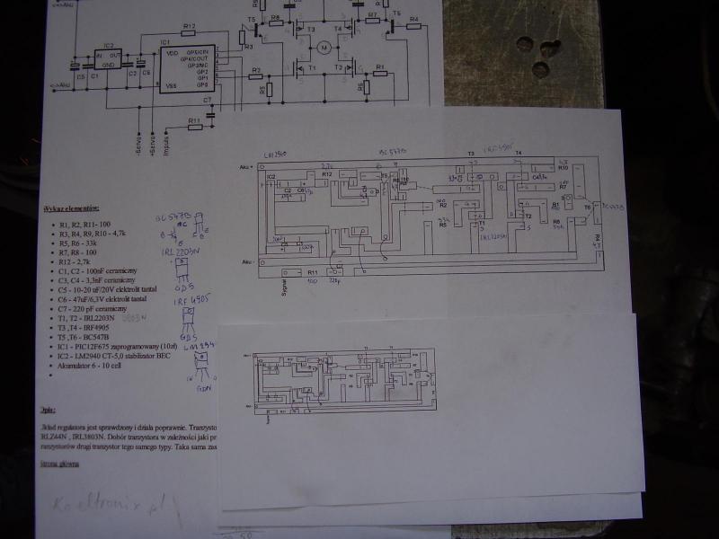 Zrobiłem regulatory do silników szczotkowych. najpierw jednokierunkowy a potem dwukierunkowy z którym były kłopoty. Najpierw grzał się stabilizator BEC, zamiennik miał inne końcówki. To spowodowało uszkodzenie mikrokomputera. Silnik chodził w jednym kierunku i grzały się mosfety. Wczoraj przyszła nowa zaprogramowana część i po wstawieniu w podstawkę działa. Pozostało teraz regulatory doprowadzić do końca. Podoginać do radiatora, koszulka i gotowe. Regulator jednokierunkowy. Przygotowane części. Schemat. Płytka, ścieżki robione dremelkiem. Uzupełnię zdjęciem całego układu.
