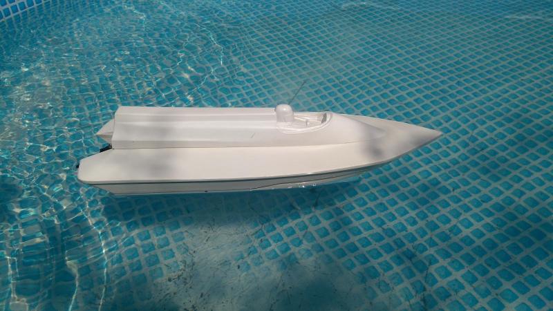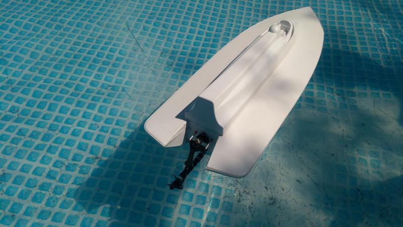 Moja nowa zabawka. Ślizg Hydrospeed. Dostałem od Janusza ABS z zespołem śruba-ster i dokończyłem. Bardzo lekki 0,7kg. W zestawie podają 1,5 kg z NiMh. Do tego powinna być kalkomania. Może się znajdzie razem z planami. Początek testów. Pływał na połowie mocy i jestem zadowolony. Czekam na czyściejszą wodę na kanale żeby popłynął na pełnej mocy. Na razie zdjęcia modelu na basenie. Połowa łopatki śruby jest nad wodą. Pływa półzanurzeniowo dając charakterystyczną fontannę.