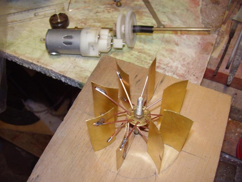 15. Zrobiłem coś nowego. Koło do bocznokołowca. Zdjęcie pierwszego koła z łopatkami. Trochę się gubiłem z tymi drucikami i dopiero jak zacząłem lutować łopatki doszedłem do ładu. Zrobiłem zdjęcie i na tym stanęło. Dzisiaj będę ustawiał kąty, odstępy, równoległość. Jak zalutuję środek to będzie właściwa sztywność. Dalej widać silnik z nałożonym trybikiem i koła. Pomimo przełożenia jak przyłożyłem duży tryb to jeszcze zapieprzał i założę ten większy.