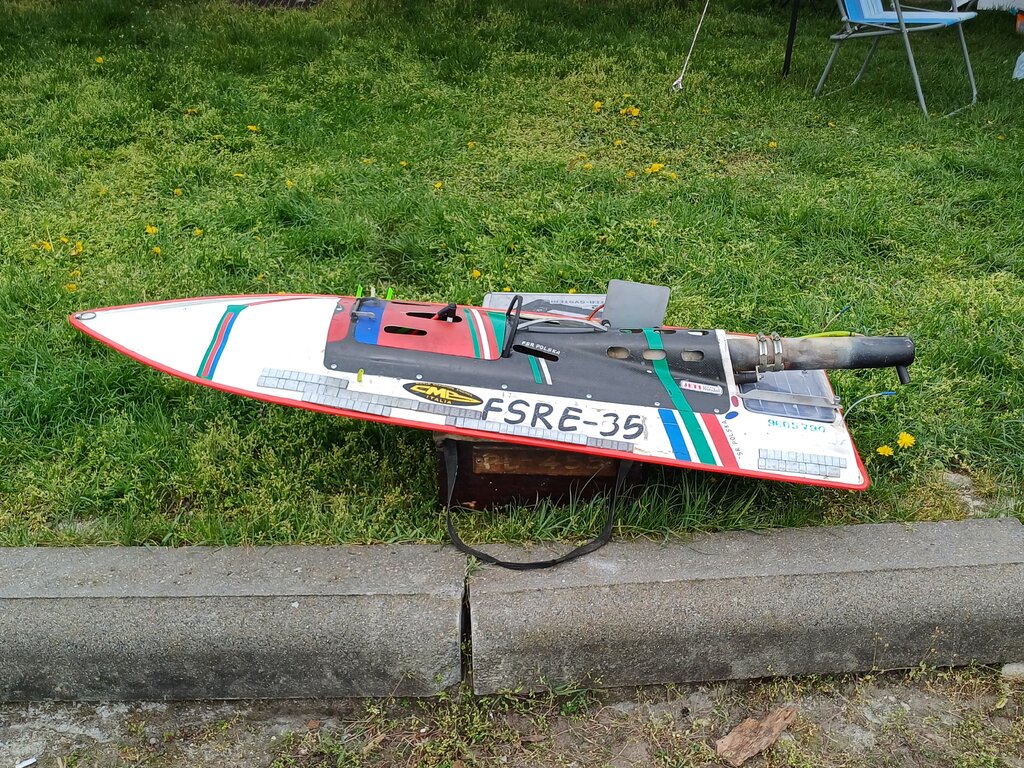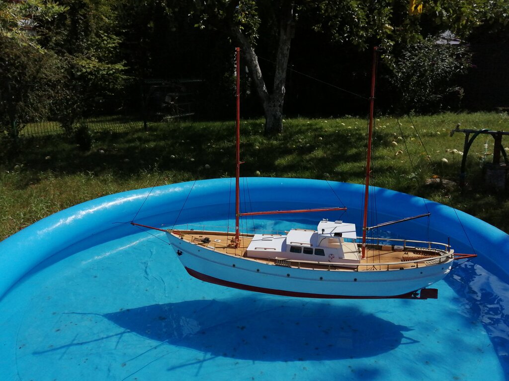 Widok na całość. Dodam jeszcze. Po uszykowaniu modelu do pływania, z balastem, waży 3,6 kg. Dokładam jeszcze zdjęcie modelu na wodzie. A te białe punkty na trawie to nie grzyby, to jabłka, spadają z drzewa.