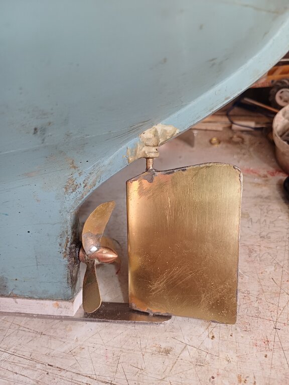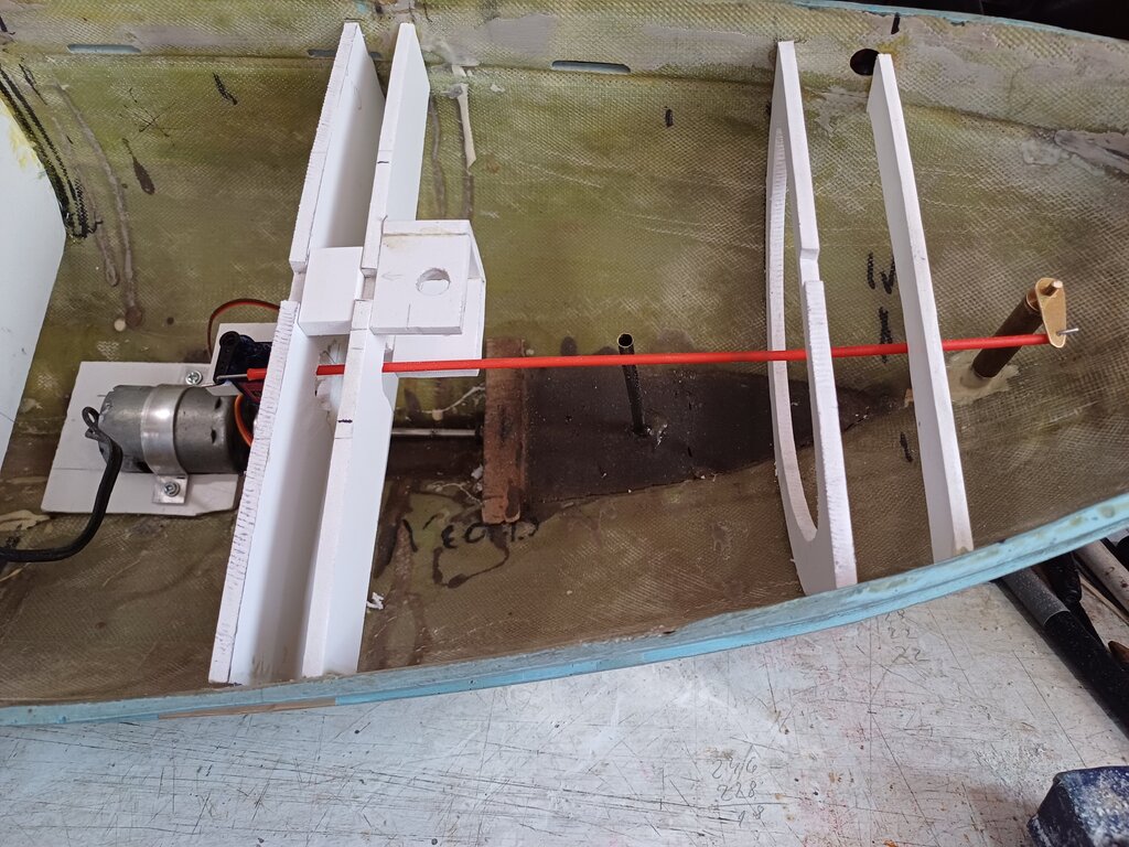 Musiałem zrobić wycięcie w stępce na silnik. Wypadł tak nisko. Śruba jeszcze nie zlutowana. Czekam na przyrząd. Sprzęgło wału bezpośrednie. -