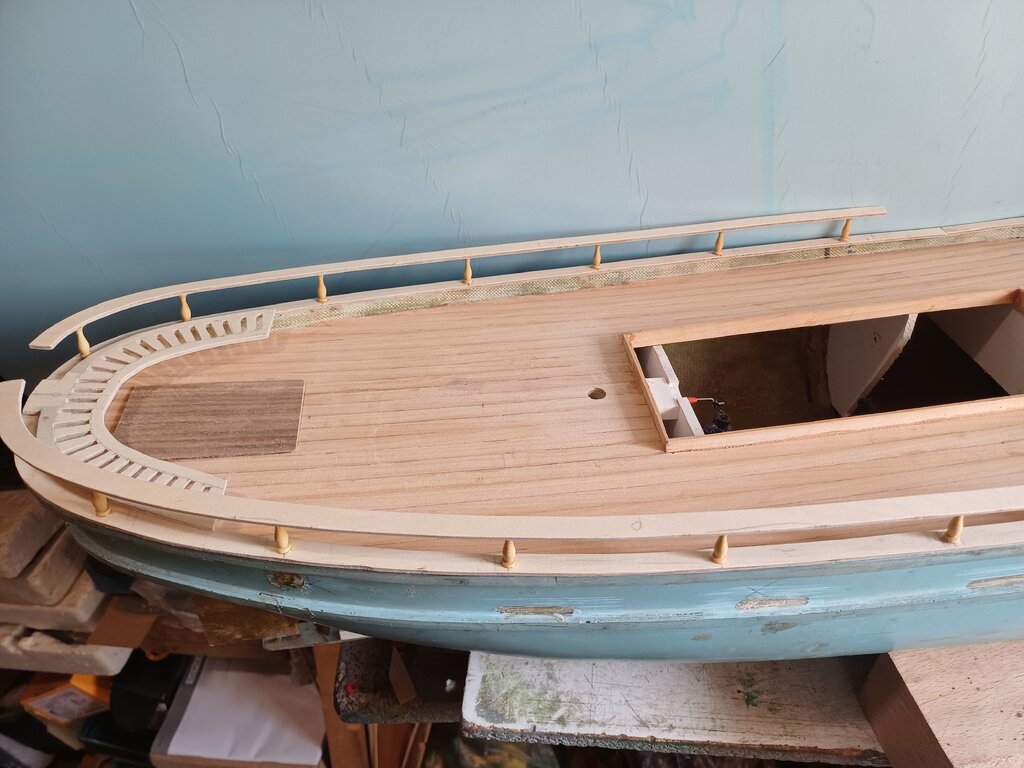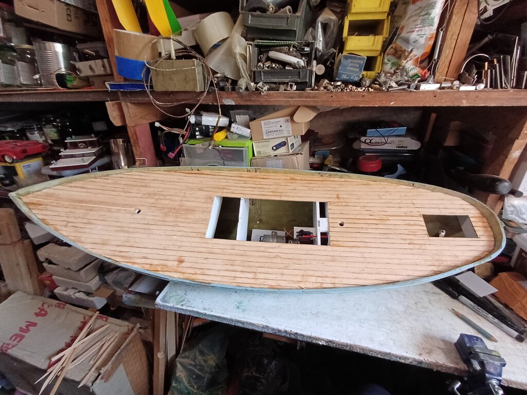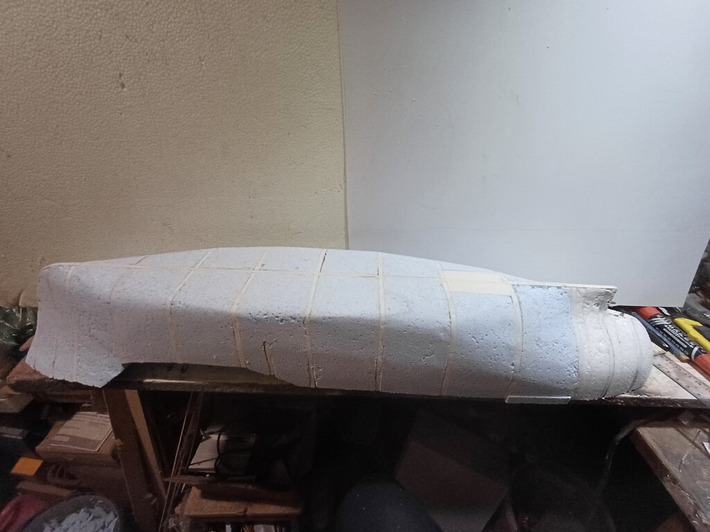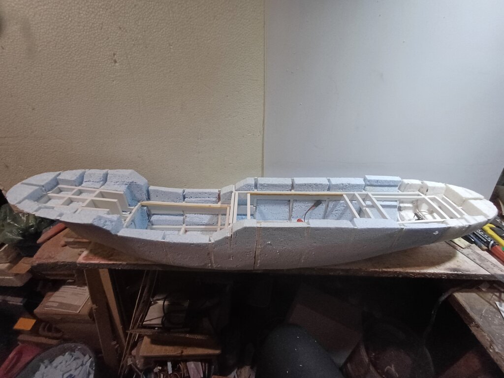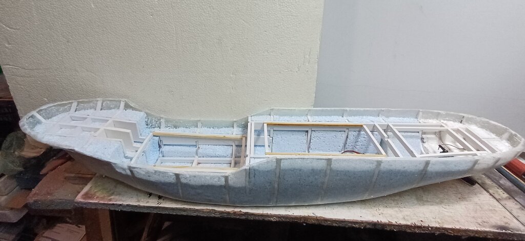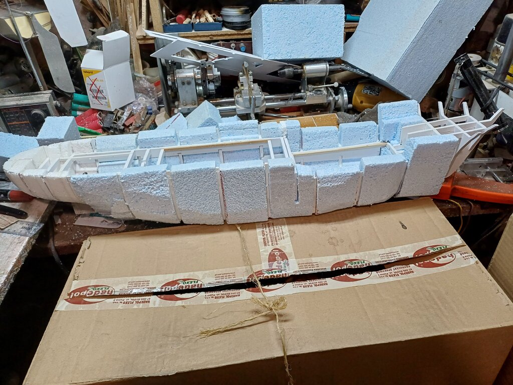 Położyłem laminat. Jedna warstwa. Wyszło dobrze. Zdjęcie przedstawia kadłub z usuniętym styropianem z wewnętrznej strony nadburcia. Dla wzmocnienia, na nadburciu będzie naklejony pasek nakładki. Płyty pokładu są już wycięte. Teraz będą wpasowane i przyklejone a potem szpachlowanie. -