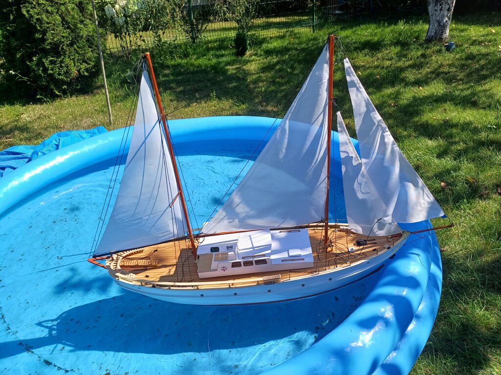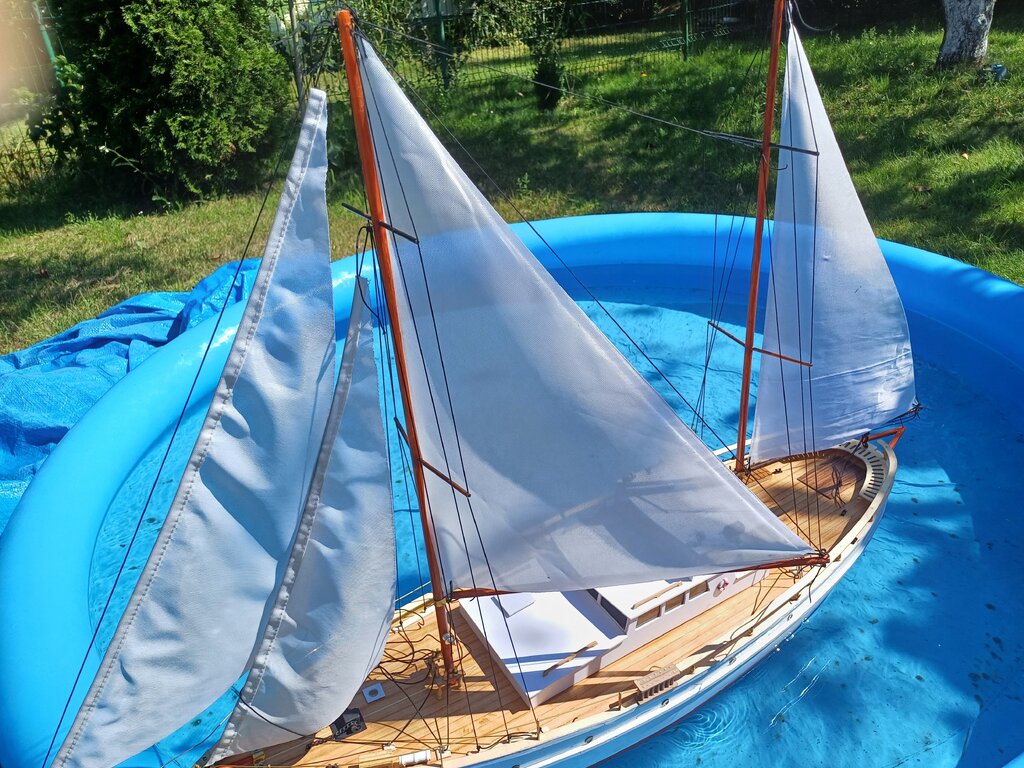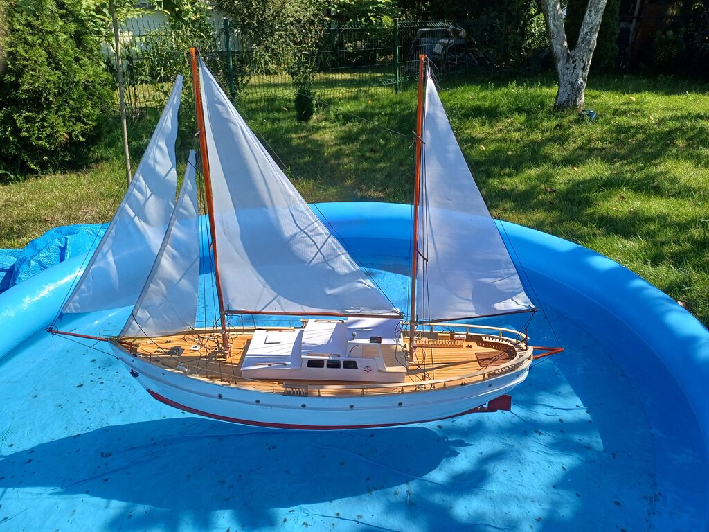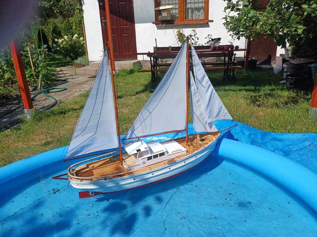 Zrobiłem żagle po amatorsku. Jeszcze są do obcięcia ogonki linek ale mogą być jakieś zmiany i łatwiej rozwiązać. Do poprawki drugi grot. Model nie jest przystosowany do pływania na żaglach pod względem balastu ale też materiał na żagle przepuszcza powietrze.