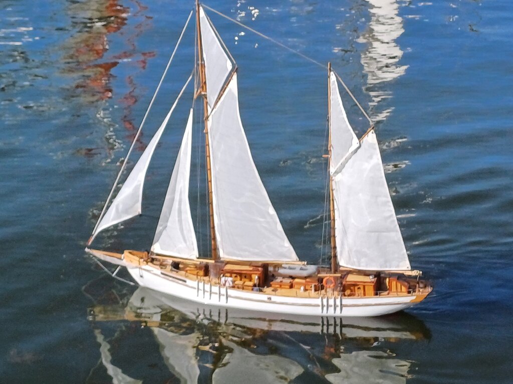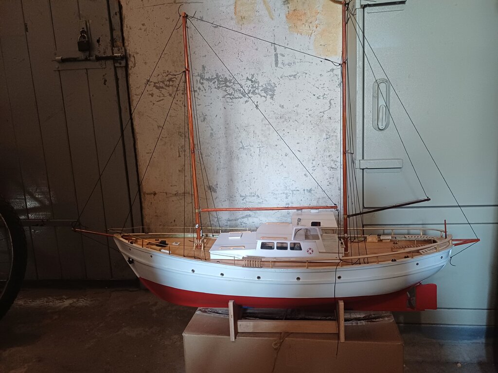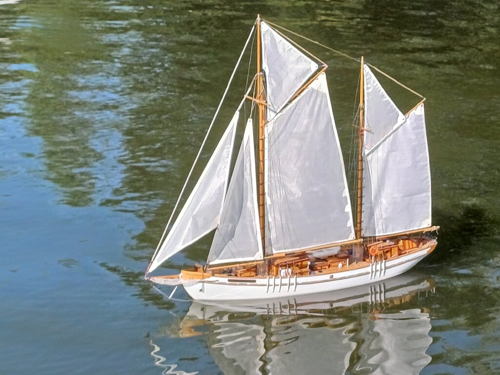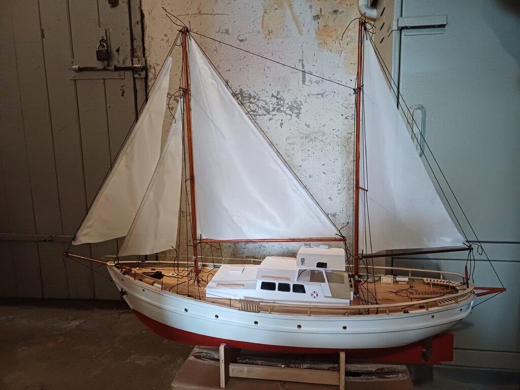 Zrobiłem żagle po amatorsku. Jeszcze są do obcięcia ogonki linek ale mogą być jakieś zmiany i łatwiej rozwiązać. Do poprawki drugi grot. Model nie jest przystosowany do pływania na żaglach pod względem balastu ale też materiał na żagle przepuszcza powietrze.