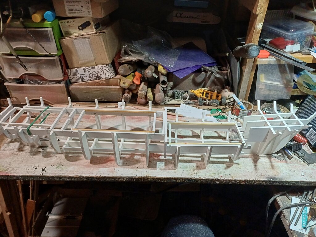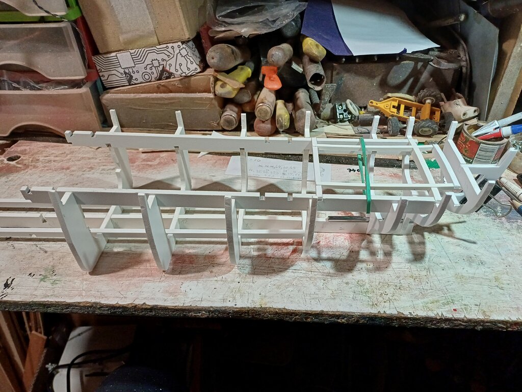 Na początku sierpnia 2024r. na podstawie instrukcji zacząłem budowę modelu frachtowca. Pierwszą robiłem nadbudówkę. Potem zabrałem się za kadłub. Wszystko robię z płyt. Elementy wycinam według powiększonych rysunków z instrukcji. Przestrzenie między wręgami wypełniłem styropianem. W tle zdjęć bałagan ale zdjęcia były robione na szybko. Miałem błękitne tło ale pociąłem na nadbudówkę i pokład. -