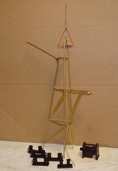 Tak i mało takich filmów. Bywają takie okresy w budowie modeli, że dłubie się, dłubie i efektów nie widać, albo kilka rzeczy zaczętych i czekają na dokończenie. Zrobiłem drugi maszt, do którego muszę dolutować wyrzutnik rakiet i zrobić mocowanie drabinek. Na zdjęciu także tablice na napis PILOT i lampy, które wymagają wykończenia, jak? Na lampach pozycyjnych odbija się światło od tła blachy brązowej zabarwiając pleksi (mają być białe).