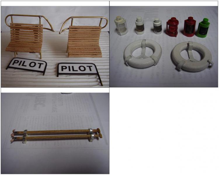 Zrobiłem następne części. Greting na taśmie klejącej żeby listewki się nie przesuwały i po wstępnej obróbce. Kotwica zrobiona z polistyrenu spienionego na ześlizgu. Pachołki i wytoczony z plexi element lampy, 2 pozycyjne w toku. Dodałem. We wtorek było 4 pływanie, tym razem motorówką. Wysoka fala powodowała kłapanie na większej prędkości.