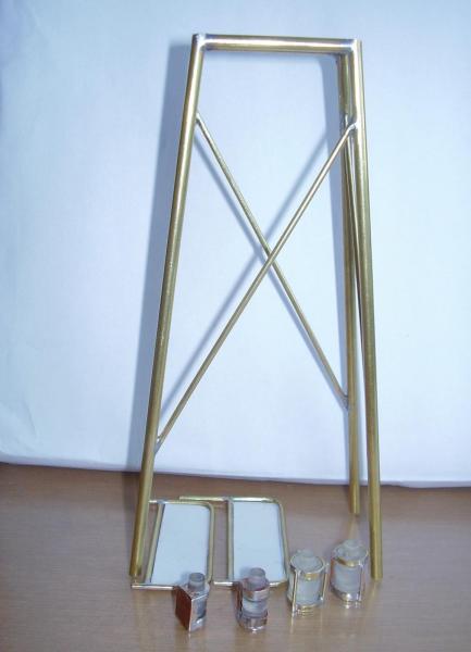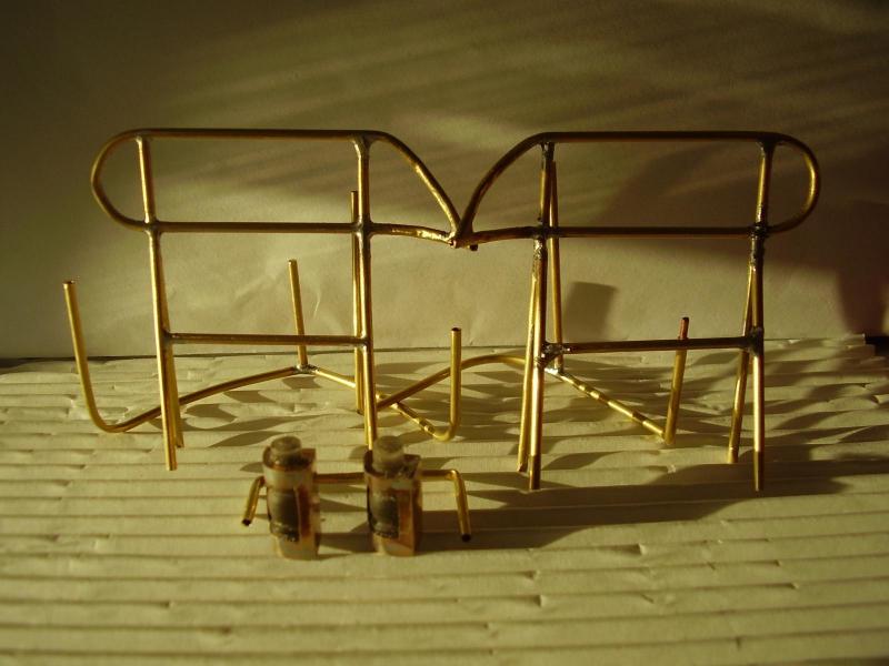 C.d. Pilot 66. Tym razem maszt. Rurki mosiężne 2,0 Wpadłem na pomysł. Mój albo nie mój. Na zdjęciu widać poprawne zagięcia rurek. Zrobiłem w ten sposób, że odciąłem 35mm drutu miedzianego o średnicy na luz w rurkę. Odmierzyłem na długim prostym drucie odległość tak aby popchnąć krótki odcinek w miejsce zaginania i wyjąć. Na wałku o odpowiedniej średnicy wygiąłem rurkę. Krótki drut już tam został. Pomysł spóżniony bo na 2 relingach spaprałem zagięcia. Maszt jest w trakcie budowy i dojdzie jeszcze więcej elementów. Widziałem dużo większe i bardziej skomplikowane. Posłużyłem się trójkątami ze sklejki cytrusowej w celu ustawienia rurek na właściwym miejscu i łatwiejszym lutowaniu..