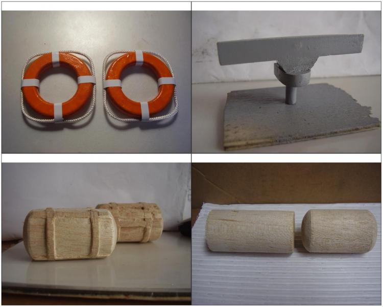 Pilot66 cd. Koła ratunkowe - brakuje tylko napisów. Antena radaru - po wstępnym malowaniu, nie będzie się obracać. Tratwy pneumatyczne - robię z balsy, z prawej obtoczone, z lewej po wstępnej obróbce. Będą nasączone żywicą. Nie wiem czy wyjdą przyzwoicie, czy będzie przeróbka.