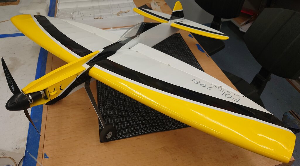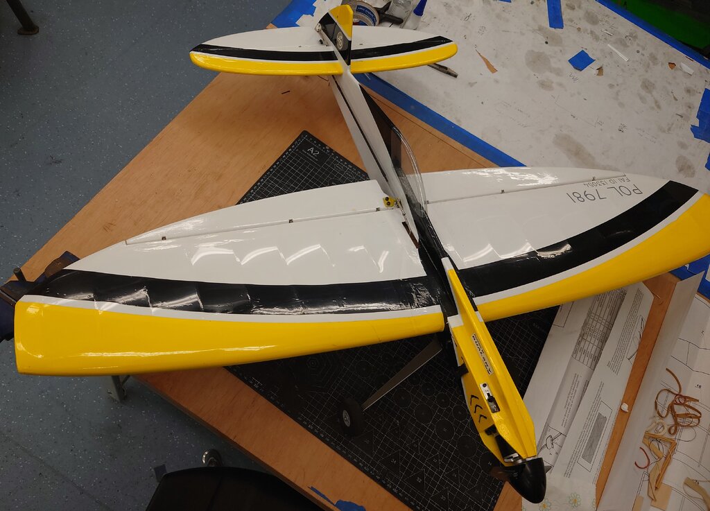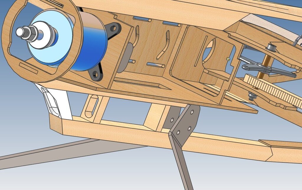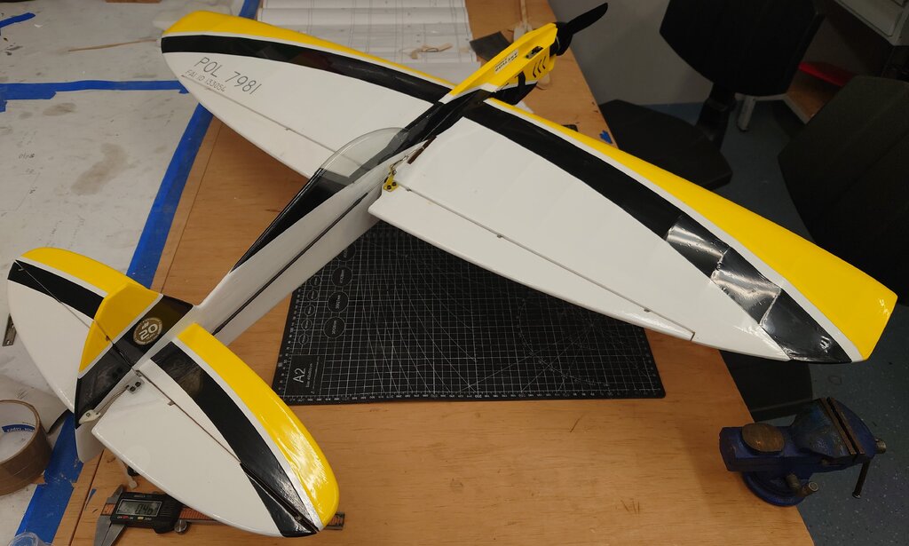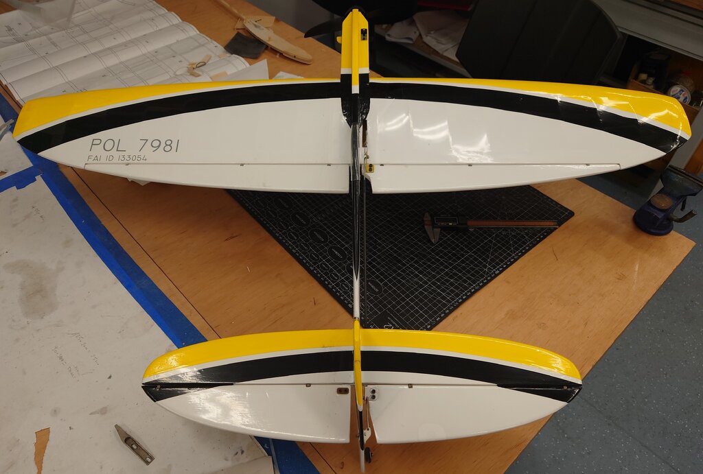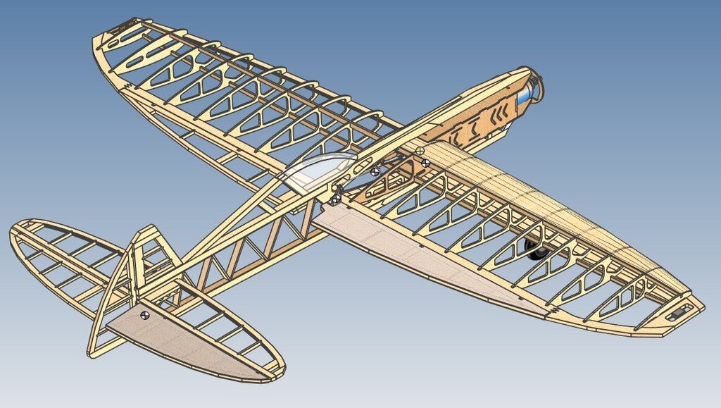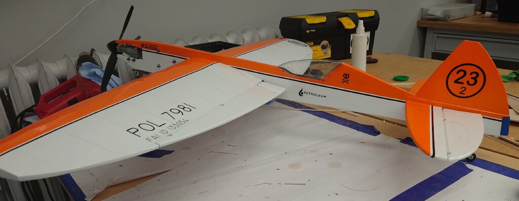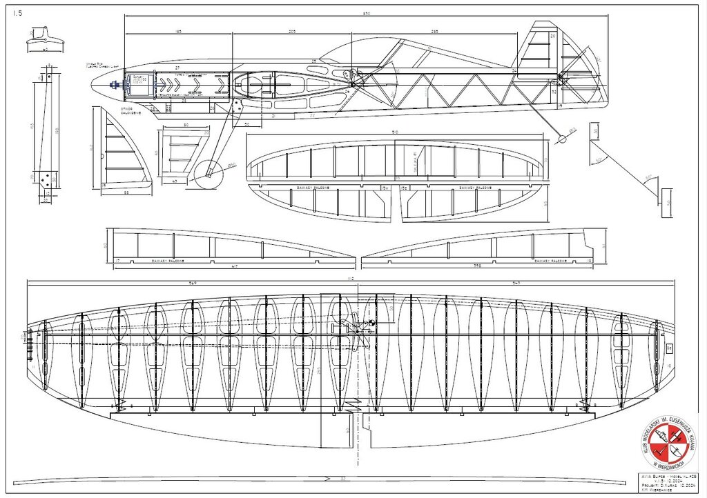 Na bazie czterech wcześniejszych wersji w tym dwóch spalinowych, został zaprojektowany przez nasz Klub, juniorski model akrobacyjny F2B z eliptycznymi skrzydłami i statecznikiem poziomym. Wielu zapewne widziało ten model na zawodach w sezonie 2024. Ze względu na sporo pytań i próśb o udostępnienie, wklejam temat. Parametry techniczne: Rozpiętość: 1112mm Długość: 830 Waga RTF: 920g Silnik: Dualsky 2820 Eco 1120 KV Regulator: Dualsky XC4015BA - 40A ( koniecznie z DGM -Dualsky Governor Mode) Zasilanie: Dualsku LiPo 3S 2200-2700 Timer pasywny ( by I.Burger) Profil skrzydła: NACA0018 modyfikowany Linki: 16m Poszczególne elementy zostały wycięte na ploterze laserowym, dzięki temu komplet części można było po wcześniejszym przygotowaniu programów, wyciąć w kilka godzin. Ze względu na ograniczenia pola roboczego plotera, niektóre dłuższe elementy ( np. dźwigar) zostały podzielone, a następnie połączone (na jaskółczy ogon). Skrzynia baterii i regulatora, ze sklejki. Dźwigar ze względu na swój kształt, również został wycięty ze sklejki. Okleina kadłuba to sklejka i balsa w części ogonowej. Podwozie z płaskownika duralowego, mocowane na kadłubie, z możliwością demontażu np. do transportu. Podobnie kółko ogonowe, jest demontowane ( nie jest to rozrysowane na planie). W załączeniu pliki dwg, pdf, jpg. Dla ułatwienia zrozumienia konstrukcji, wklejam kilka screenów z modelu 3D. Szczegóły rozwiązań. Pokrycie folią termokurczliwą. Elementy zdobienia, z tej samej foli wycięte na ploterze laserowym. Model bez problemu i z łatwością wykonuje program akrobacji juniorskiej ale również pełny program. Ze względu na długość linek czas dla pełnego programu: 4:30 + 0:30 min. Do tego sportowa sylwetka, która ładnie prezentuje się zarówno w locie jak i na pasie startowym. Pilot na tym modelu zdobył w sezonie 2024 Mistrzostwo Polski Juniorów. 😄 W styczniu 2025 została wprowadzona modyfikacja, wprowadzająca zmienne wychylenie steru kierunku. Pierwsze loty testowe konstruktora modelu, przy łagodnym wietrze były bardzo pozytywne. Model zdecydowanie lepiej zachowywał się w ósemkach pionowych, klepsydrze i ósemkach pod pułapem. Wcześniej zdarzały się utraty naciągu. Możliwe, że spowodowane precesją powodującą tendencję do skręcania, lub innymi błędami konstrukcyjno-wykonawczymi ale pewności nie mam. Zachęcam do budowy i latania. Małe zestawienie wersji "rozwojowych modelu" 1.0 - niebieski, 1.2 - pomarańczowy, 1.4 - zielony ( pierwszy elektryczny), 1.5 - żółto-czarny AVIA_2022Elipse_v1.5_final.pdf AVIA_2022Elipse_v1.5_final.dwg