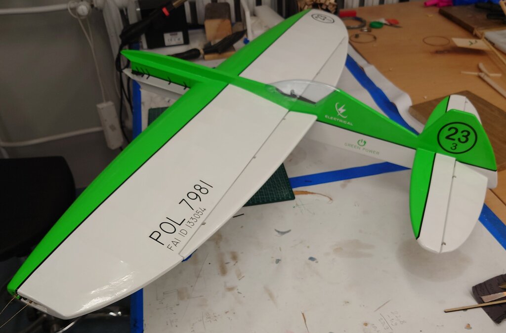 Kolejny model w naszej stajni, jest w końcowym etapie projektowania. Faza koncepcyjno-obliczeniowa zakończona. Trwa detalowanie i za chwilę ruszy budowa prototypu. Krótka charakterystyka: - rozpiętość 1100m - długość 850mm - pow. skrzydeł 25,5 dm2 ( ok 1,5 dm2 wiecej niż Avia elktro) - pow. statecznika poziomego i steru wysokości 5,7dm2 - szacowana waga RTF - 950g - elektryczno napęd, bateria LiPo 3S 2200mAh Model przeznaczony dla Juniorów, do wykonania pełnego programu w klasie F2B/M, ale również cały program seniorski powinien dać radę wykonać. Zobaczymy po pierwszych lotach. Projekt bazuje na sprawdzonych proporcjach i elementach konstrukcyjnych, modelu Avia elektro 1.5, aczkolwiek idea to uproszczenie budowy pod kątem młodzieży, stąd mniej obłe / eliptyczne kształty. Komora baterii, mocowania silnika, regulatora, timera oraz orczyka jest jednym elementem (z przegrodami), zbudowanym ze sklejki 2mm. Skrzydła natomiast będą wycinane ze styropianu, przy czym natarcie, spływ i dźwigar będą z listewek/desek balsowych. Okleina skrzydeł w miejscu łączenia z kadłubem, wykonana będzie ze sklejki. Pozostała powierzchnia pokryta będzie cienkim papierem gazetowym na rzadkim wikolu, a następnie pokryta wielobarwną folią. Klapy, stateczniki i kadłub, oklejone z zewnątrz balsą, a następnie również folią. Przewidziane jest regulowane wyprowadzenie linek. Możliwe że zostanie zastosowany mechanizm odchylania steru kierunku. Relacje z budowy wkrótce....