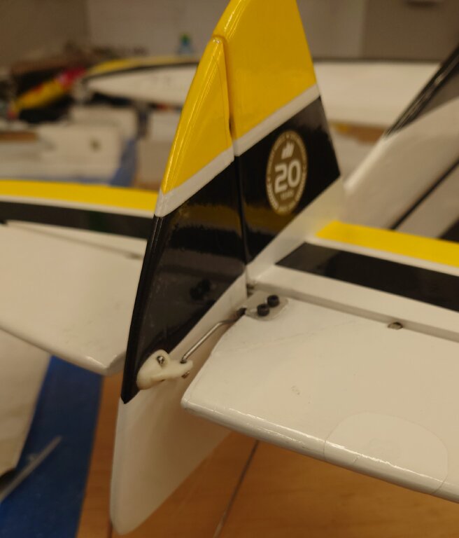 Generalnie proste. Ster wysokości jest dźwignią. Cięgno z drutu mocujemy w osi tej dźwigni ( w środku grubości steru wysokości), ramię tej dźwigni to odległość zamocowania cięgna od osi obrotu czyli osi zawiasów ( np 15mm). Ster kierunku przy poziomo ustawionym sterze wysokości powinien być lekko wychylony na zewnątrz tak jak do normalnego lotu poziomego z "normalnym" naciągiem linek. Każda zmiana na sterze wysokości czyli jego obrót wzg. Osi zawiasów powoduje że punkt zamocowania cięgna na zadanym ramieniu przemieszcza się po półkolu w górę lub w dół i zawsze ciągnie cięgno, powodując odchylenie steru kierunku zawsze w prawo. Wartość odchylenia zależy od dźwigni zamocowania na sterze wysokości i kierunku. Inaczej nie umiem wytłumaczyć, a na telefonie trudno mi coś naszkicować.