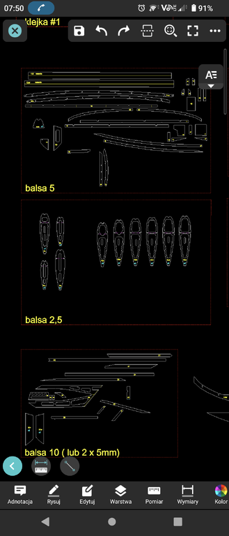 W pliku Dwg są opisane i rozdzielone wszystkie pozycje, tj wzg materiału i grubości. Częściowo zrobiony nesting dla desek szerokość 100mm. Pozycje są ponumerowane ale w zespołach tzn. np statecznik poziomy to zespół 16 i wszystkie elementy o numerze 16 wchodzą w jego skład ( różne grubości balsy, sklejka wzmacniająca). Przy okazji: okleina statecznika poziomego, pionowego, sterów wysokości, klap, ma grawerkę z jednej strony - po to aby od razu na niej kleić wewnętrzne elementy konstrukcyjne. Materiały. W zasadzie jest to balsa i sklejka. Elementy z duralu to orczyk, dźwignie i podwozie. Popychacz z rurki węglowej i sprych rowerowych (fi 2,2mm) + dwa snapy regulowane - jeden na popychaczu przy dźwigni klap od strony orczyka, drugi przy dźwigni steru wysokości. Taki układ pozwala dokładnie wyregulować układ sterowania. Kółka fi 45-50 piankowe. Pozdrawiam Darek -