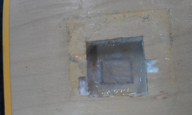ciąg dalszy prac, tym razem załatanie dziury w płacie: niewiem czy mój sposób jest dobry ale kiedyśtak zalepiłem sporą dziurę w poszyciu skrzydełka okolo 5-7cm x 7 cm więc tak zrobiłem najpierw wyrównałem poszarpaną dziurę, doprowadziłęm ją do łądnego kwadratu, miałem akurat kawałek sklejki około 4-5 mm i ją rozwarstwiłem skalpelem z rozwarstwioneej sklejki zrobiłem kwadracik aby był dopasowany do otworu. dno poszycia obsmalrowałem delikatnie żywicą a od zewnętrznej strony podkleiłem papierową taśme samoprzylepną aby mi trzymała kwadracik w jednej pozycji, na to nałożyłem kartkę zwykłego papieru od xero która wcześniej pożądnie nasączyłem żywicą i nałożyłem na uzupełnioną dziurę pare razy podosiskałem i zebrałem nadmiar żywicy. w skrzydel ten patent się sprawdził zobaczymy jak tu wyjdzie. teraz wygląda to tak