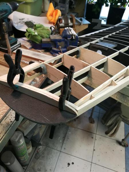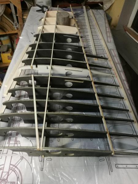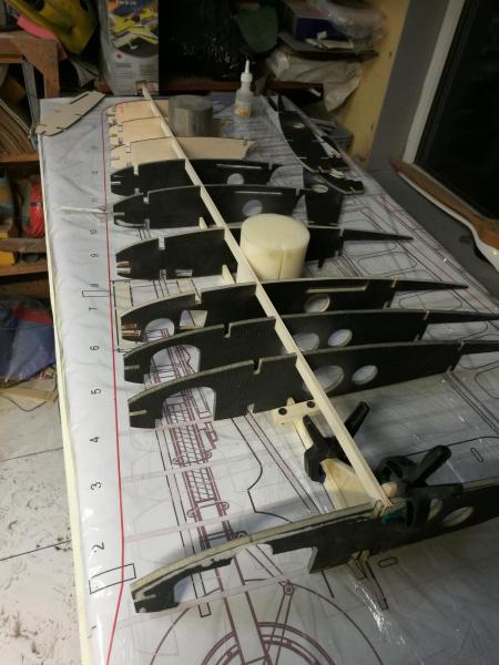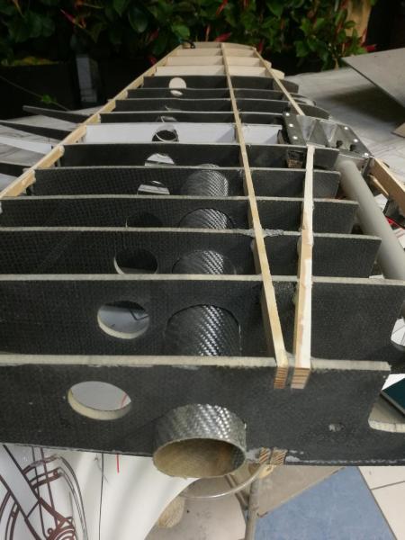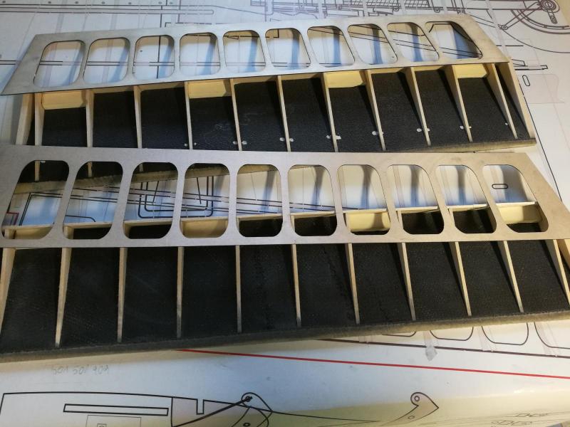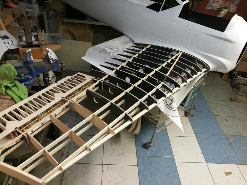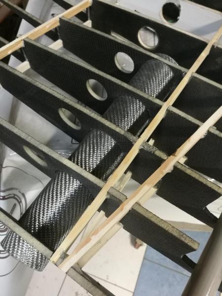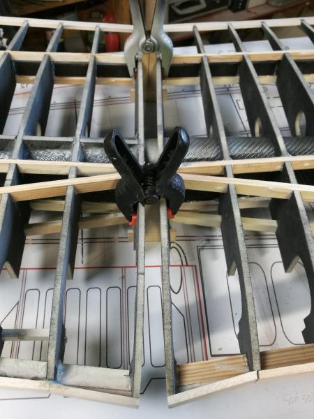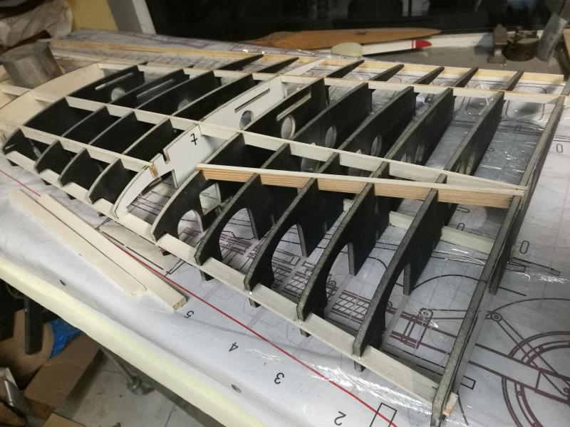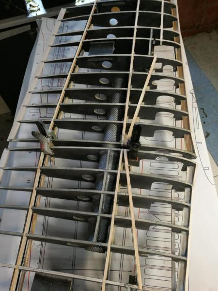 tak to nie tajemnica to Tomek z Jet Polu ten który robi silniki odrzutowe Andrzej masz rację ale w fw nie będzie T-ownika tylko c-ownik albo zrobię skrzynkę , taki teownik zastosowałem w Storchu i tam faktycznie listwy położyłem poziomo ale w nich wyfrezowałem bruzdę i pionowe elementy zatopiłem w niej tutaj jest za mało miejsca na taki sposób montażu więc doklejam węglowe płytki na boki tych listew , chciałem z jednej strony ale chyba zrobię z obu stron.