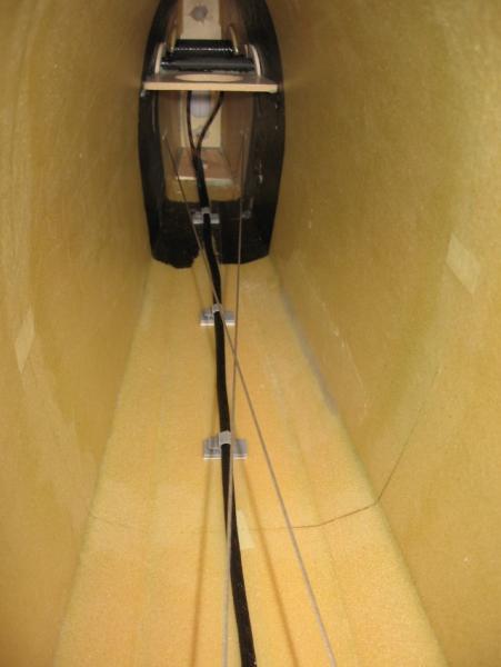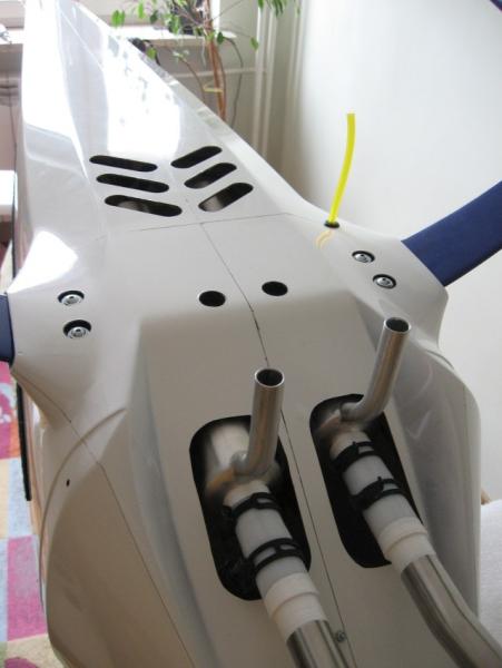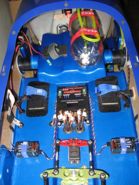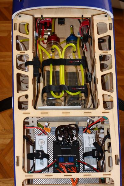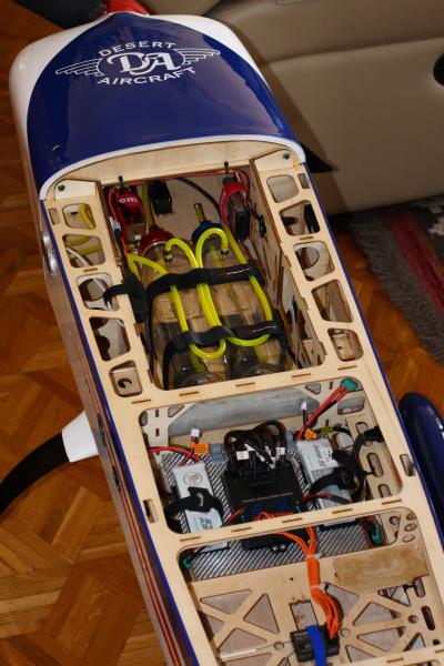 21. Lecimy dalej Kadłub zagospodarowany. Prądem rządzi competition srs, zapłonem Sparkswitch, na kierunku futaba 31kg. Zbiornik paliwa postanowiłem zrobić z butelki od coli plus korek od Secrafta. Do tej pory zawsze stosowałem zbiorniki Dubro, ale to chyba będzie lepsze rozwiązanie bo można cały czas monitorować stan instalacji wewnątrz zbiornika. Z silnikiem DA 100, tłumikami MTW 75 i takim rozmieszczeniem gratów model ma delikatnie tylne wyważenie na rurze. Lepiej pakiety umieścić bliżej silnika z tym, że ja muszę pakiety wyciągać do ładowania dlatego zostawiłem tak jak jest i dołożyłem 200g ołowu z przodu za silnikiem.