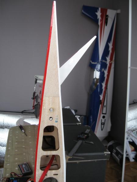 Darek najważniejsze, że się nie rozleciała Patyki jak to patyki, wszystkie się trzęsą od wibracji. Dziś były robione skrzydełka Dźwignie 1,5 cala, kabelki Powerbox z konektorami Mpx. Trzeba tylko zarobić wtyczki jr. Max wychylenia zrobiłem 45 stopni. Można więcej ale chyba tyle powinno starczyć. Piotrek czerwone ubranka na miejscu -