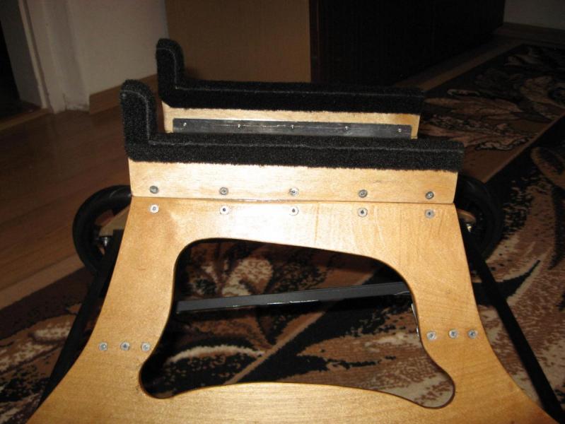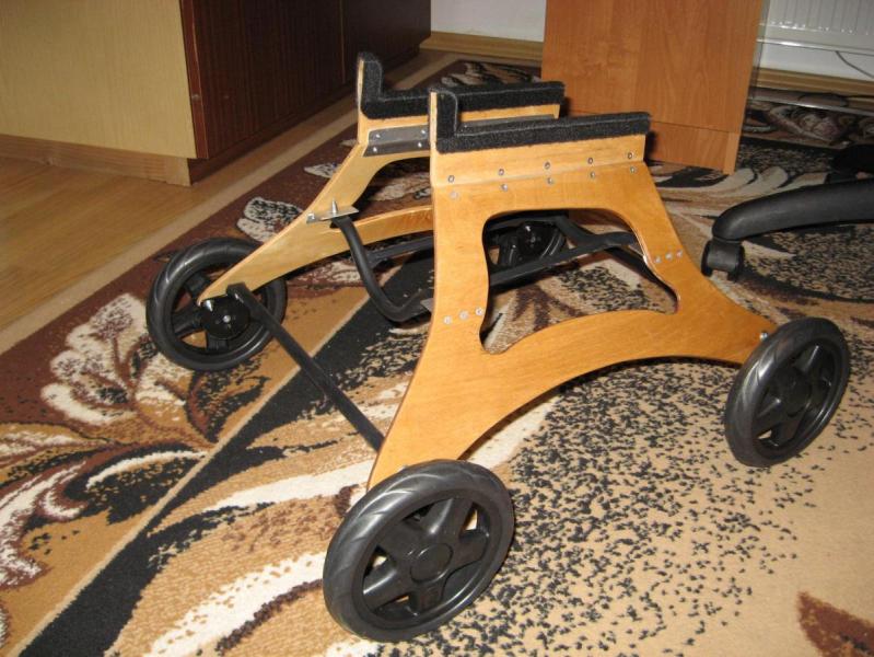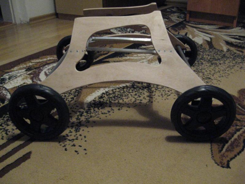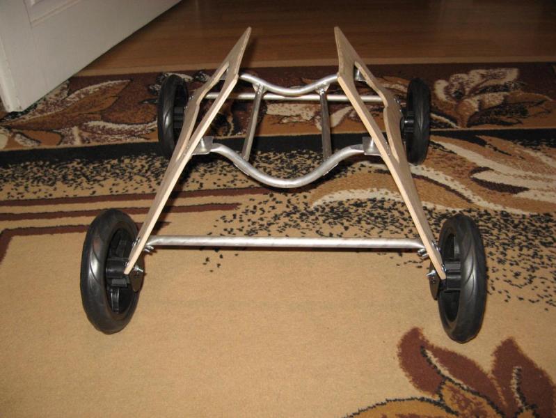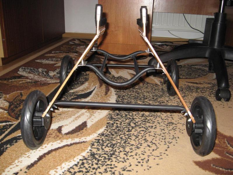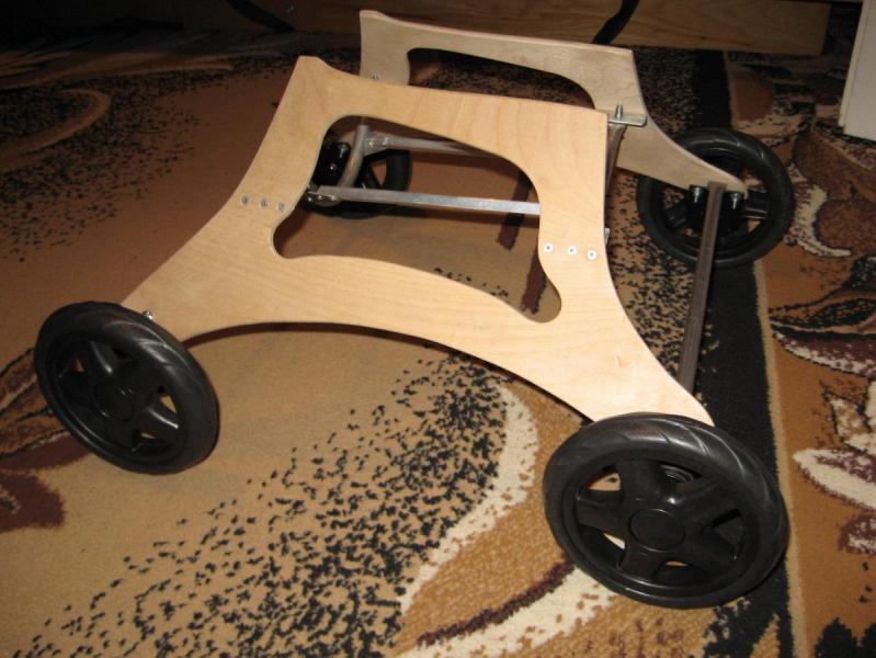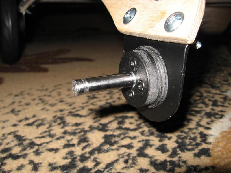 Witam, kilka fotek mojego wózka startowego stan wstepny Koła zakupione na allegro, trzeba szukać kółek do walizek kosztują chyba po 3 zł/szt Ośki dorabiane ze śruby M8, polerowane papierem i rowki nacięte na tokarce na zabezpieczenia, da się tez zrobić na wiertarce Resztę konstrukcji wyjaśniają zdjęcia. Na wszelkie pytania chętnie odpowiem.
